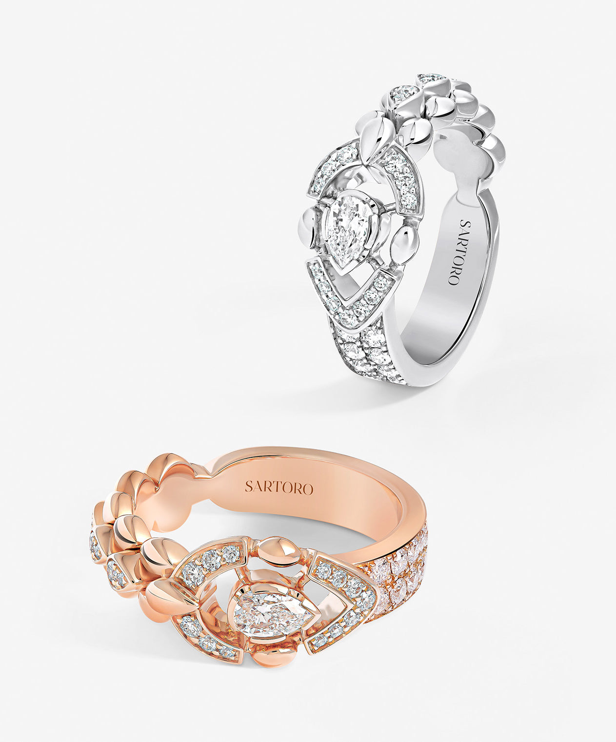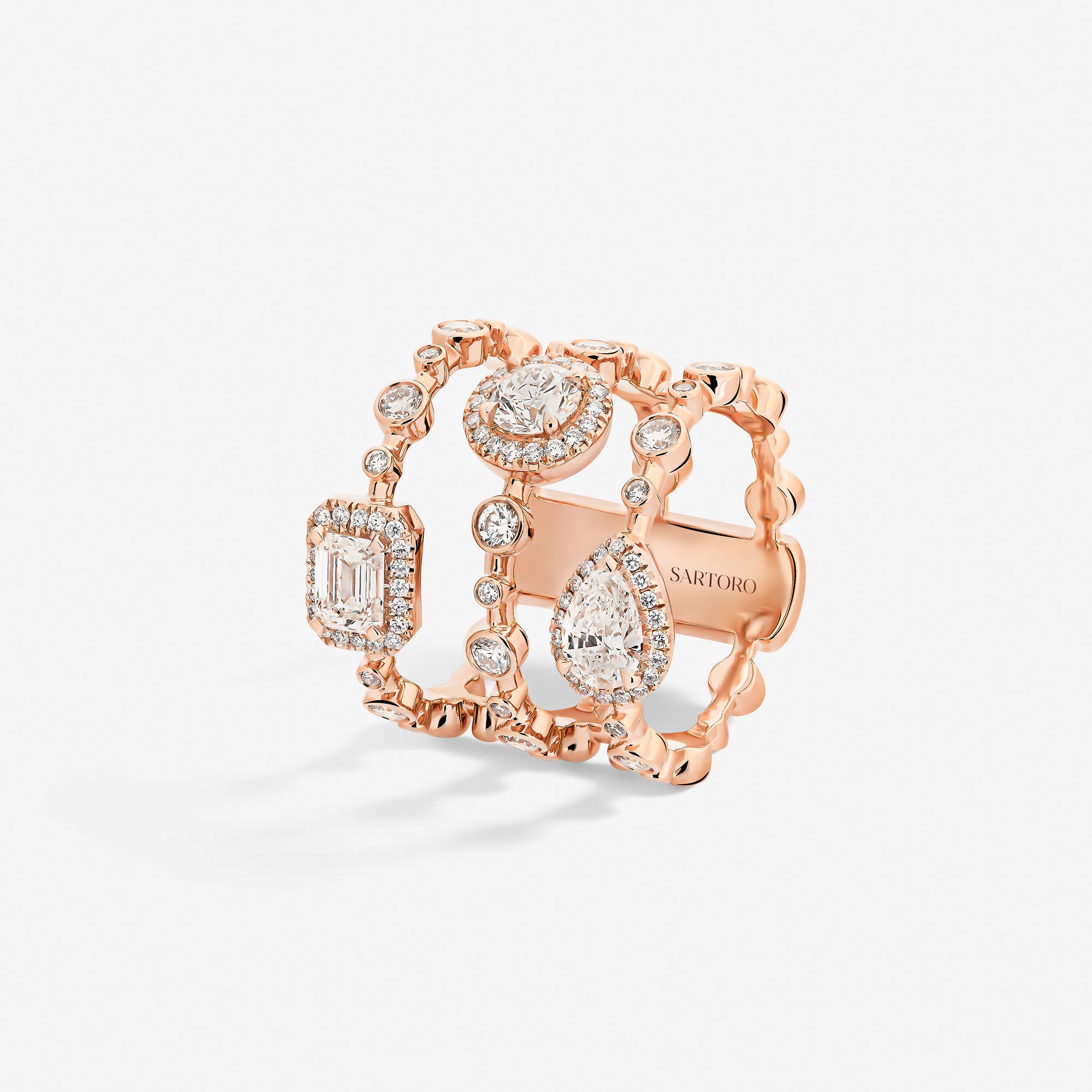 Dualité Iconic ring crafted in 18K rose gold and set with round brilliant diamonds and a central pear-shaped diamond.