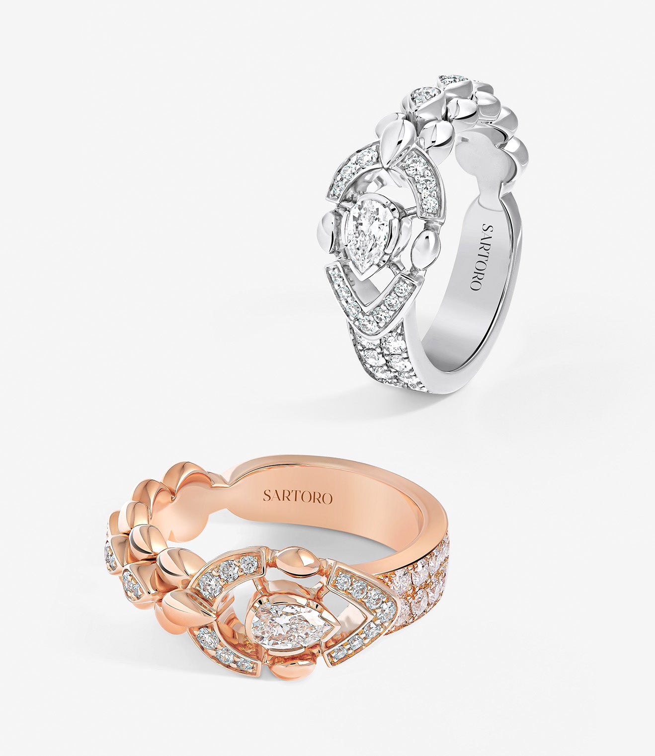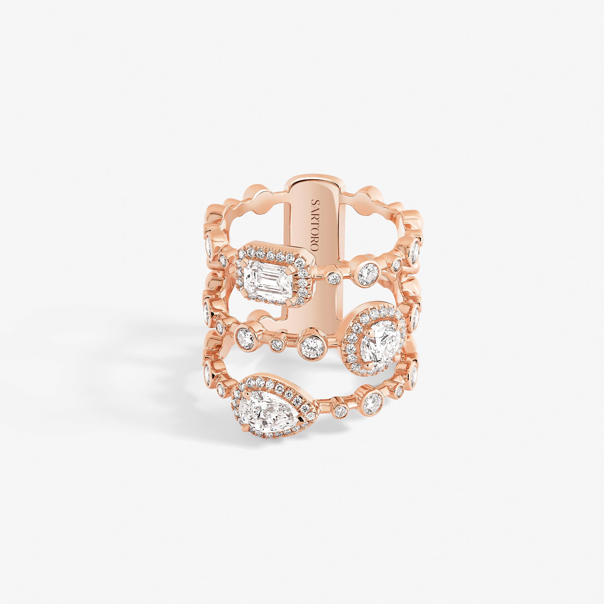 Dualité Iconic ring crafted in 18K rose gold and set with round brilliant diamonds and a central pear-shaped diamond.