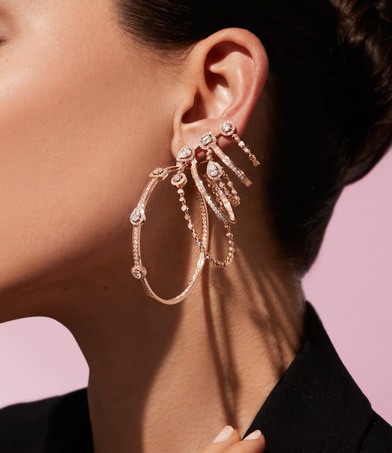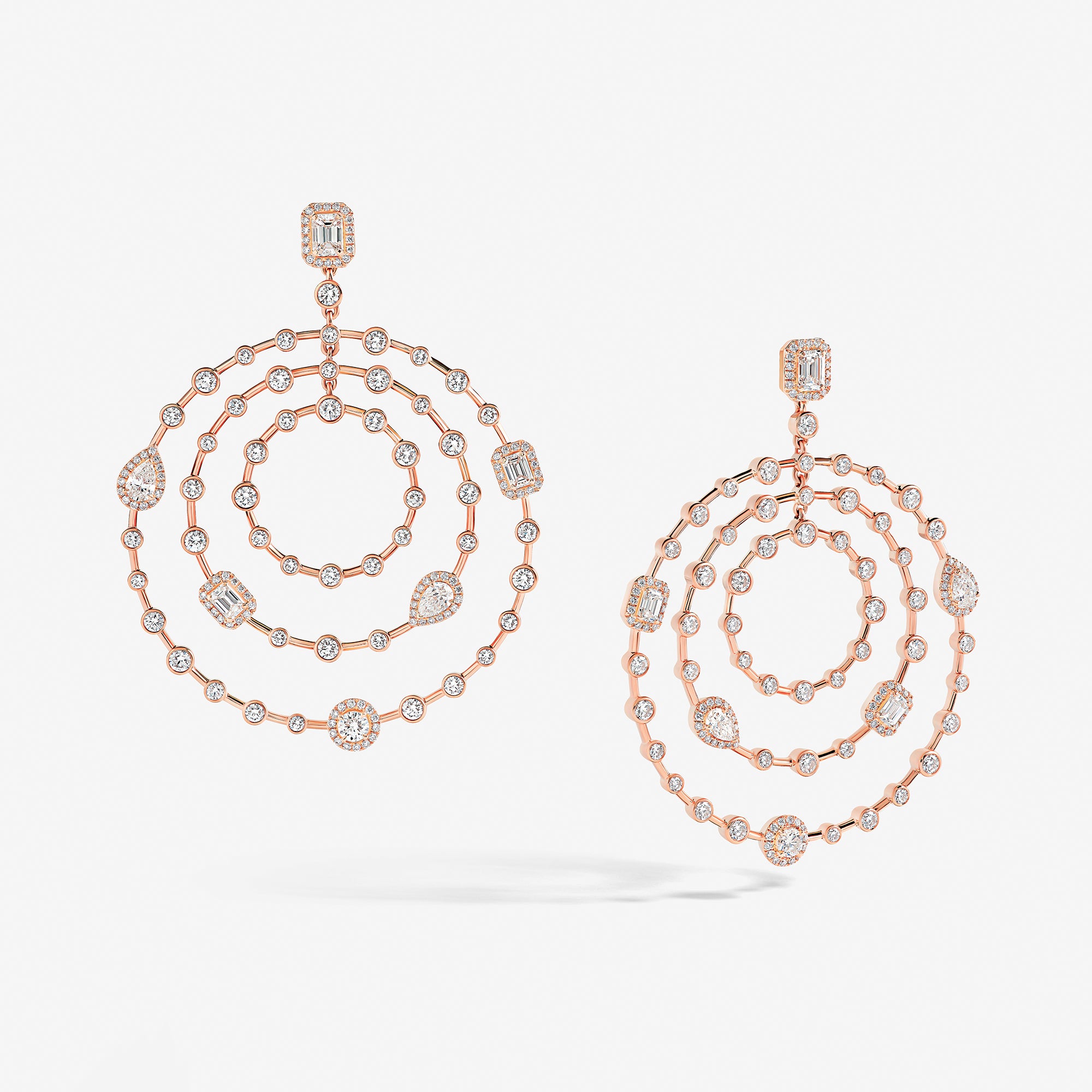 Trilogie Radiance Signature round earrings crafted in 18K rose gold and set with round brilliant, emerald cut and pear-shaped diamonds.
