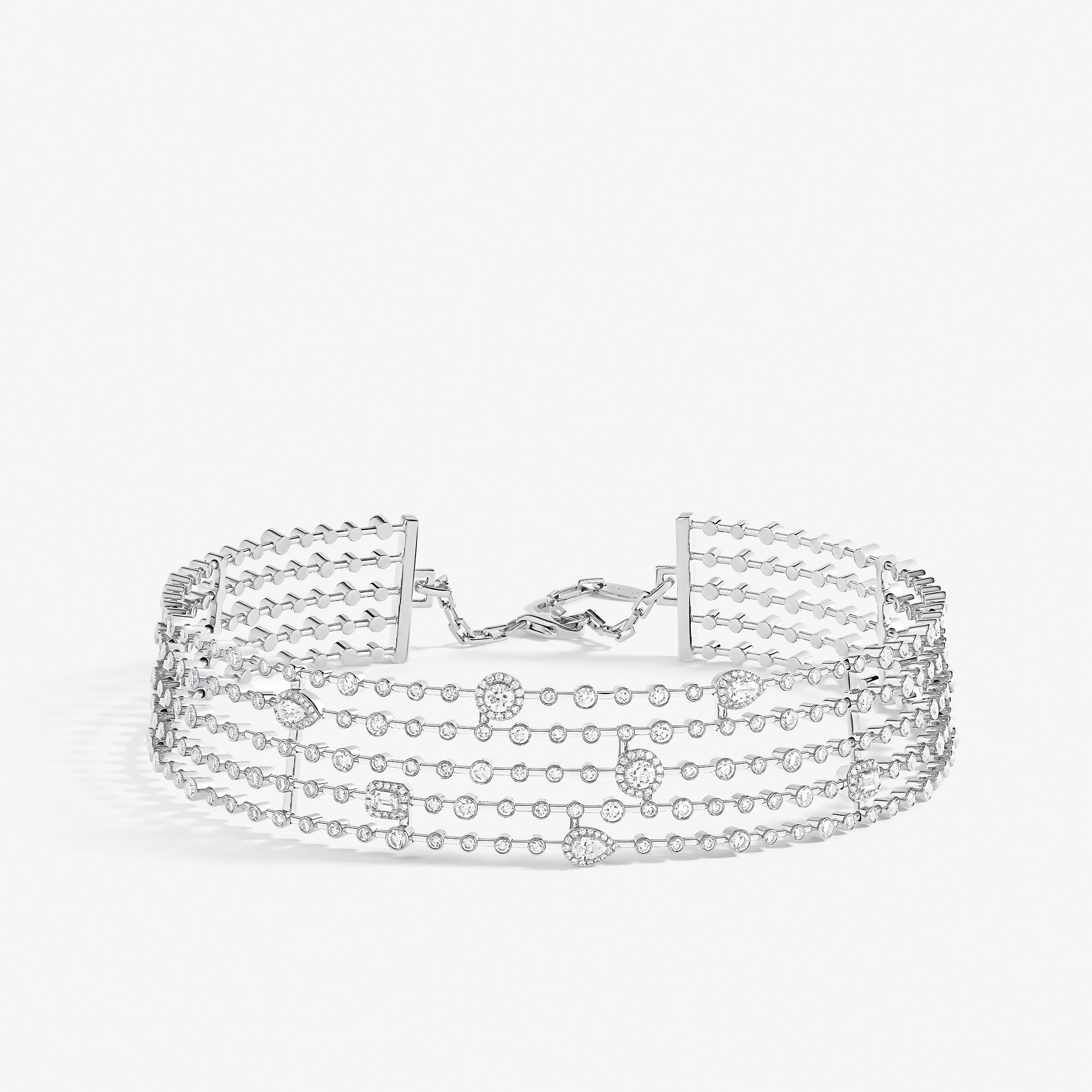 Trilogie Radiance Signature five row flexible choker crafted in 18K white gold and set with round brilliant, emerald cut and pear-shaped diamonds.