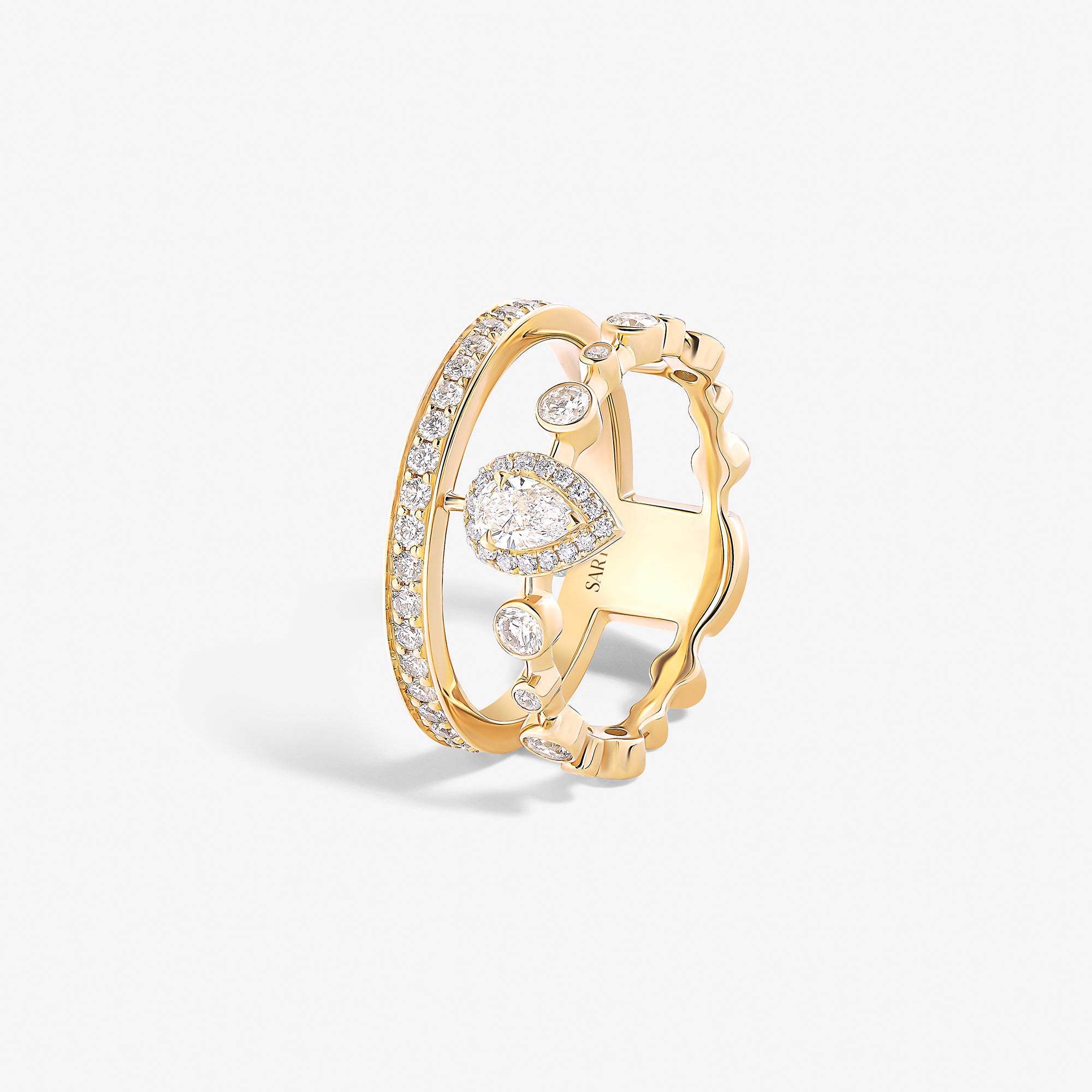 Trilogie Radiance Forever ring with central pear-shaped diamond crafted in 18K yellow gold and set with round brilliant and pear-shaped diamonds.