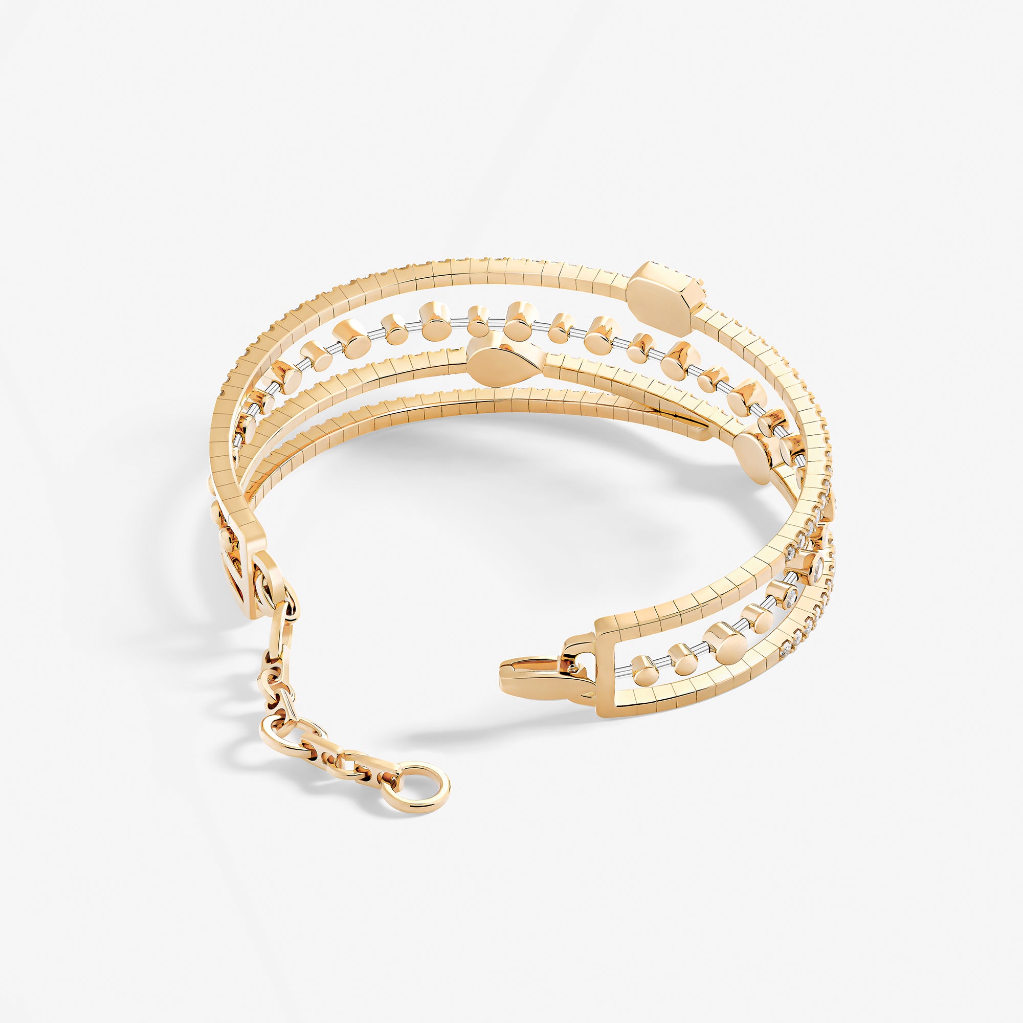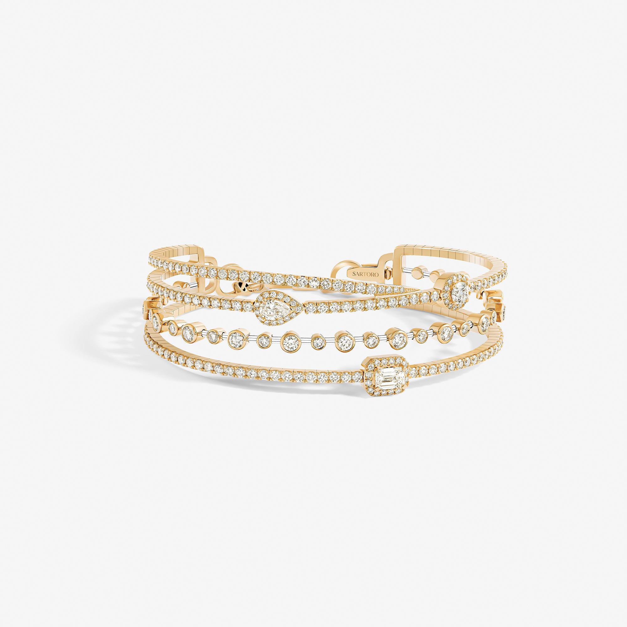 Emblematic of the House values and aesthetic codes, the pieces dazzle with the symbol of the trinity, elevated through three diamond cuts – brilliant, emerald, and pear –, which are brought together within each piece for a unique harmony.