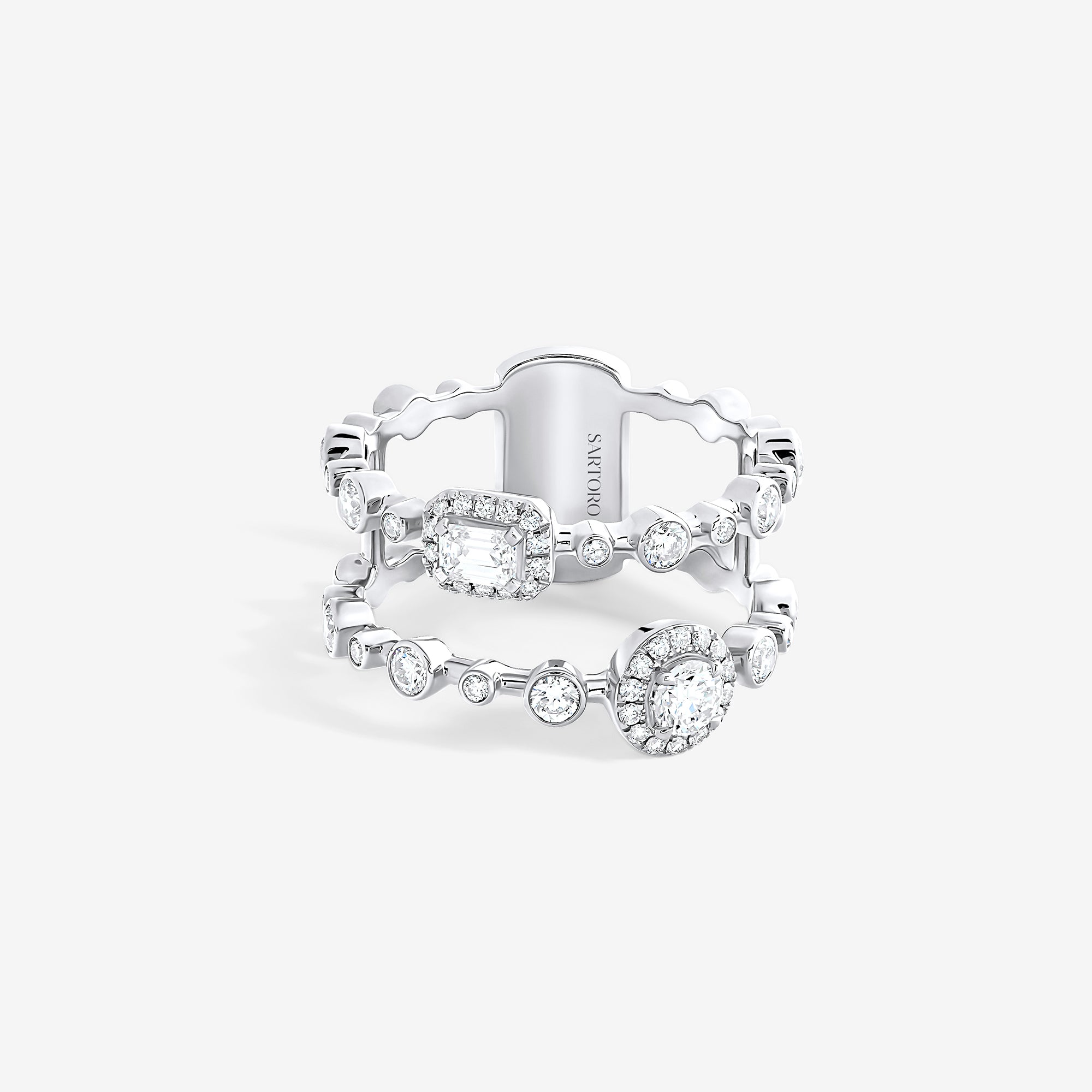 Trilogie Radiance Signature two row ring crafted in 18K white gold and set with round brilliant, emerald cut and pear-shaped diamonds.