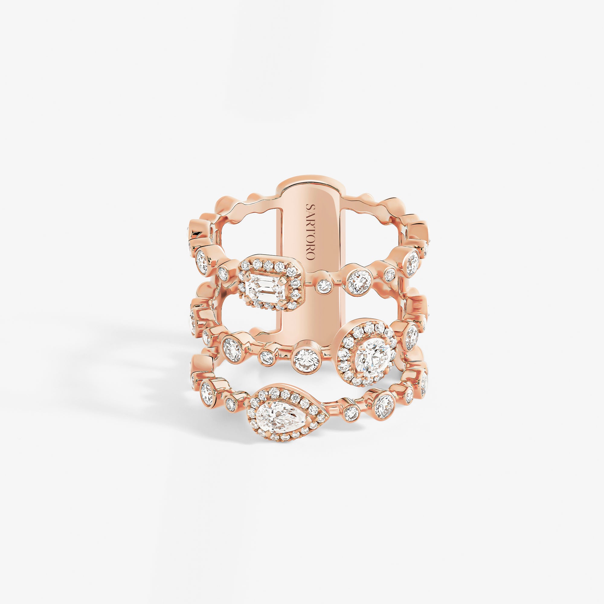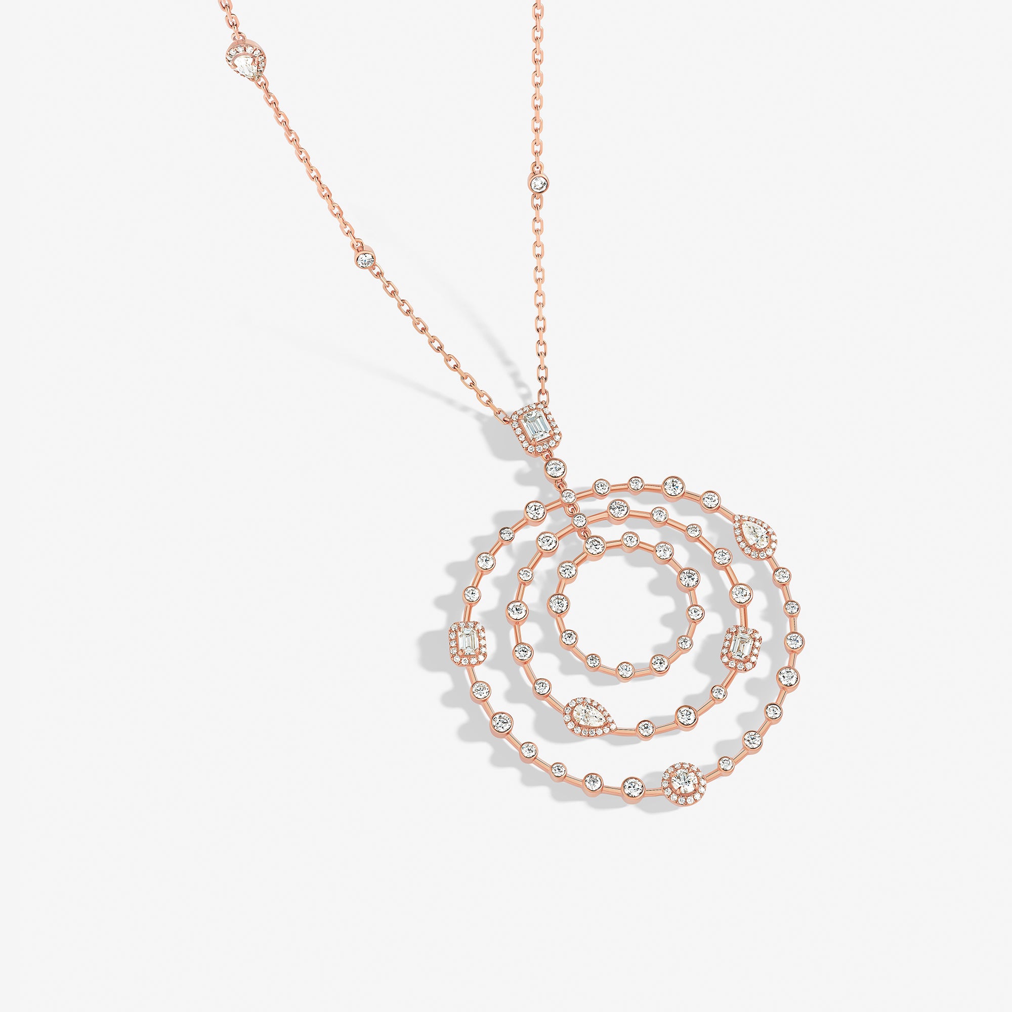 Trilogie Radiance Signature pendant crafted in 18K rose gold and set with round brilliant, emerald cut and pear-shaped diamonds.