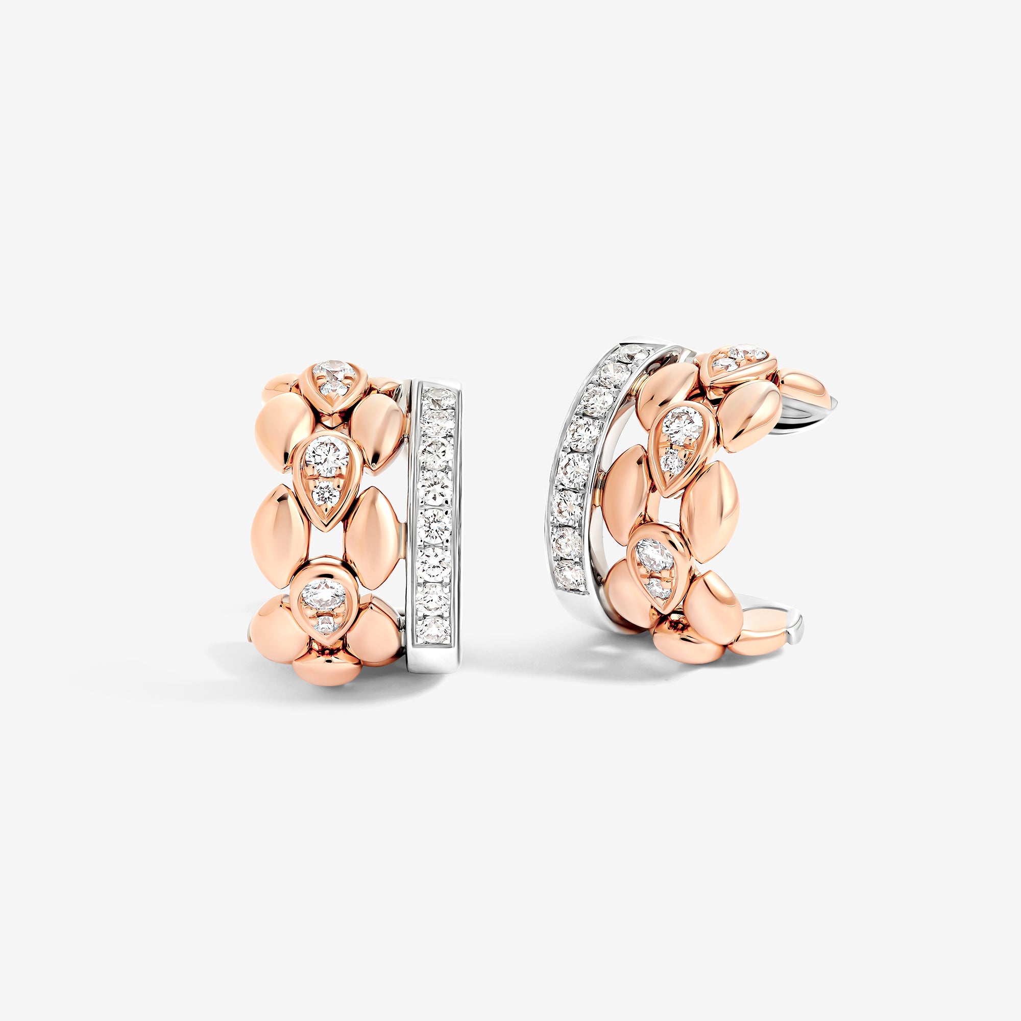 Dualité Two Tone huggie hoop earrings crafted in white and rose gold and set with round brilliant diamonds.
