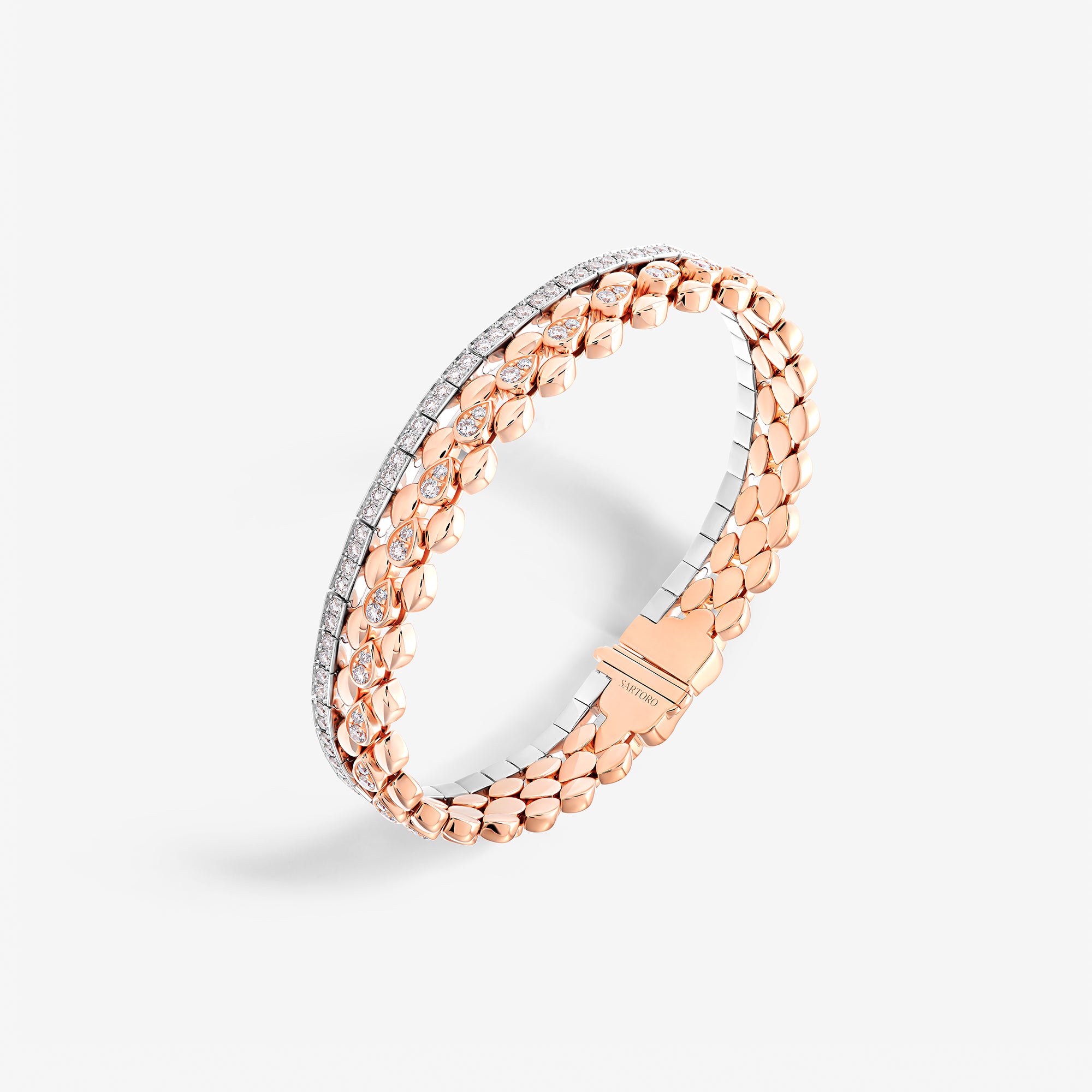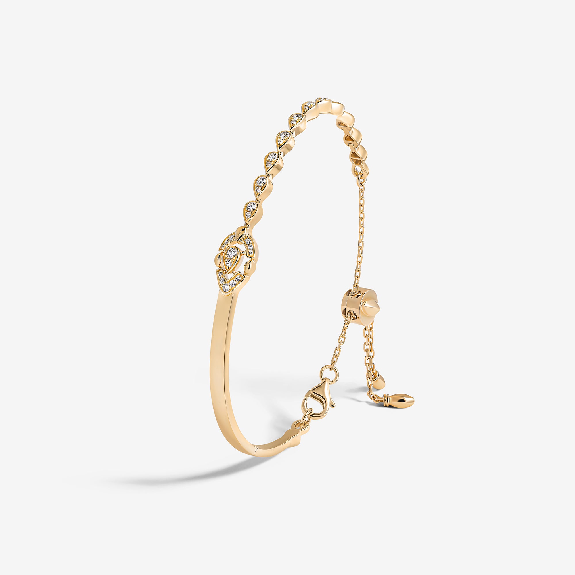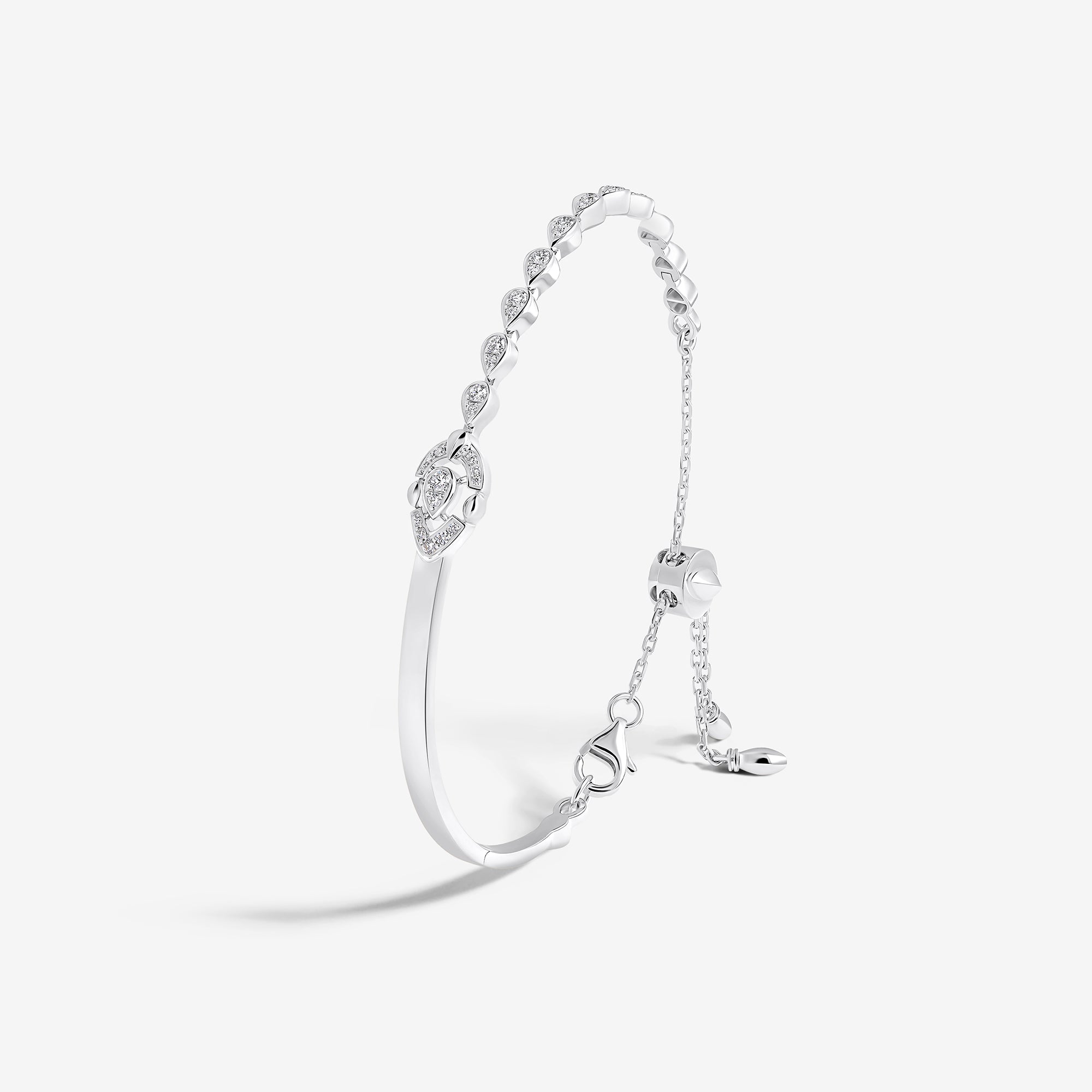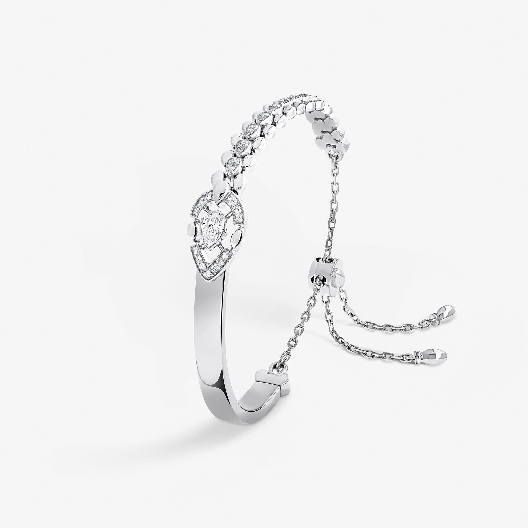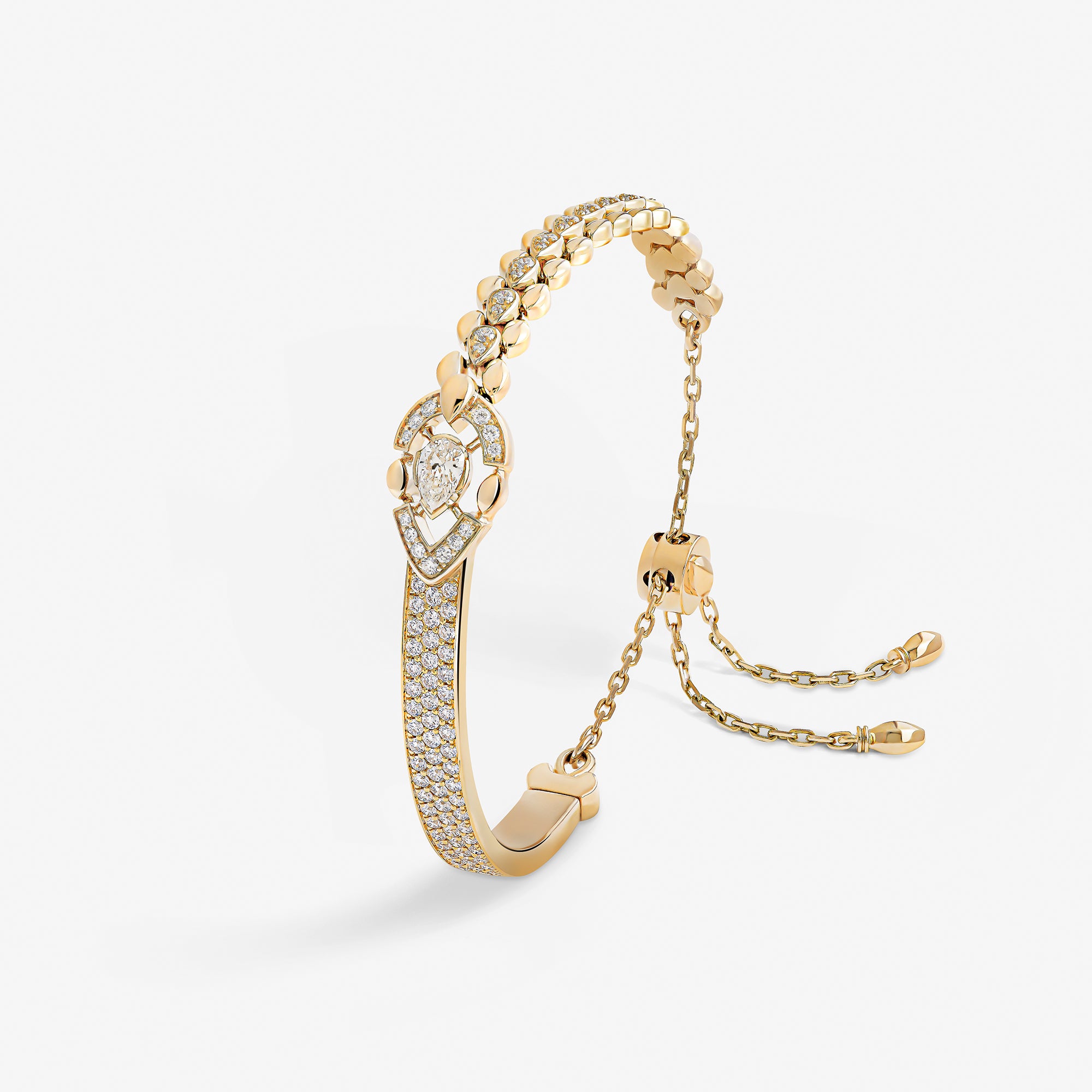 Each piece of this emblematic collection features two distinct halves united by a pear-cut central diamond, playing on contrasts in texture, gold crafting, and gem-setting methods. Their encounter embodies an irresistible fusion where contrasting forces attract.