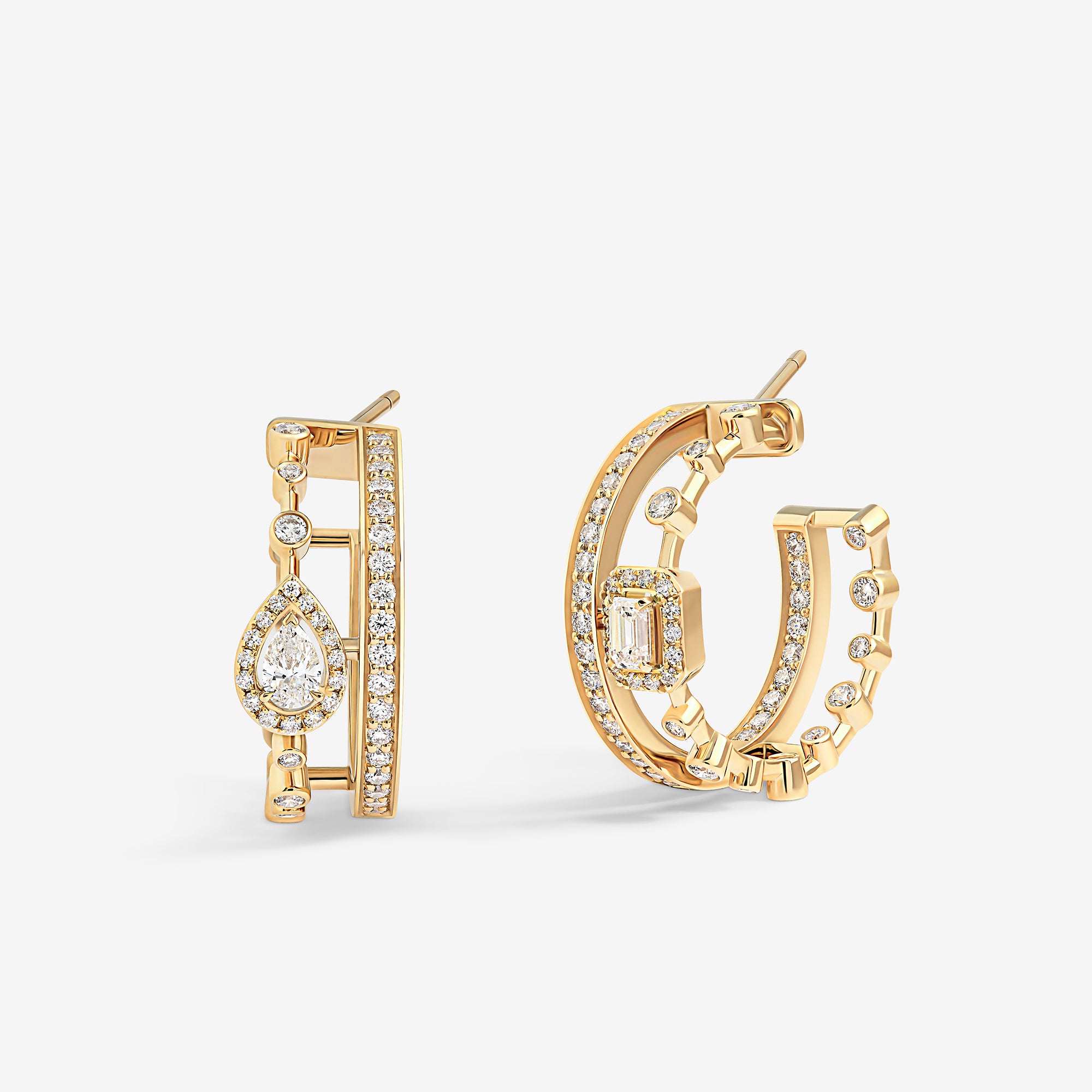 Trilogie Radiance Forever small hoop earrings crafted in 18K yellow gold and set with round brilliant, emerald cut and pear-shaped diamonds.