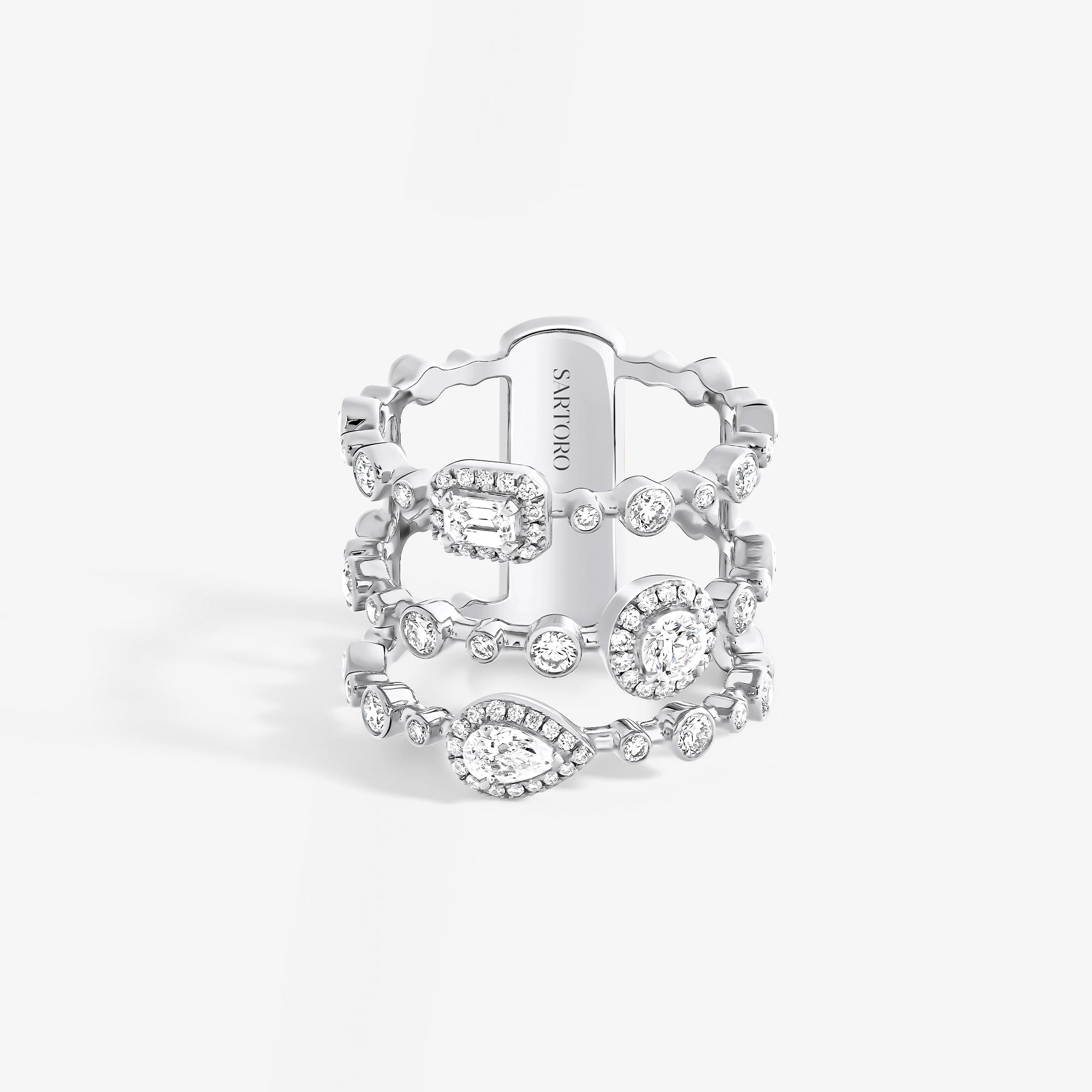 Emblematic of the House values and aesthetic codes, the pieces dazzle with the symbol of the trinity, elevated through three diamond cuts – brilliant, emerald, and pear –, which are brought together within each piece for a unique harmony.