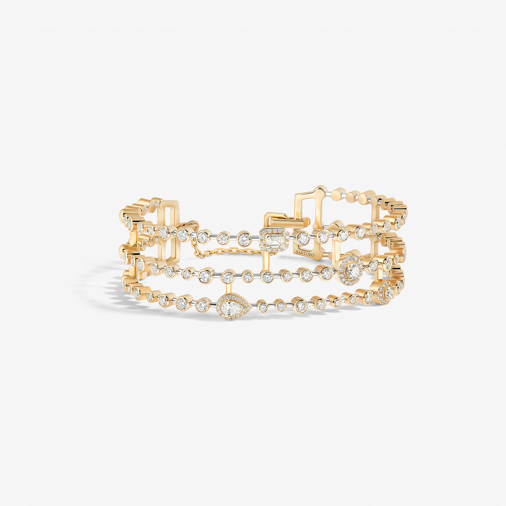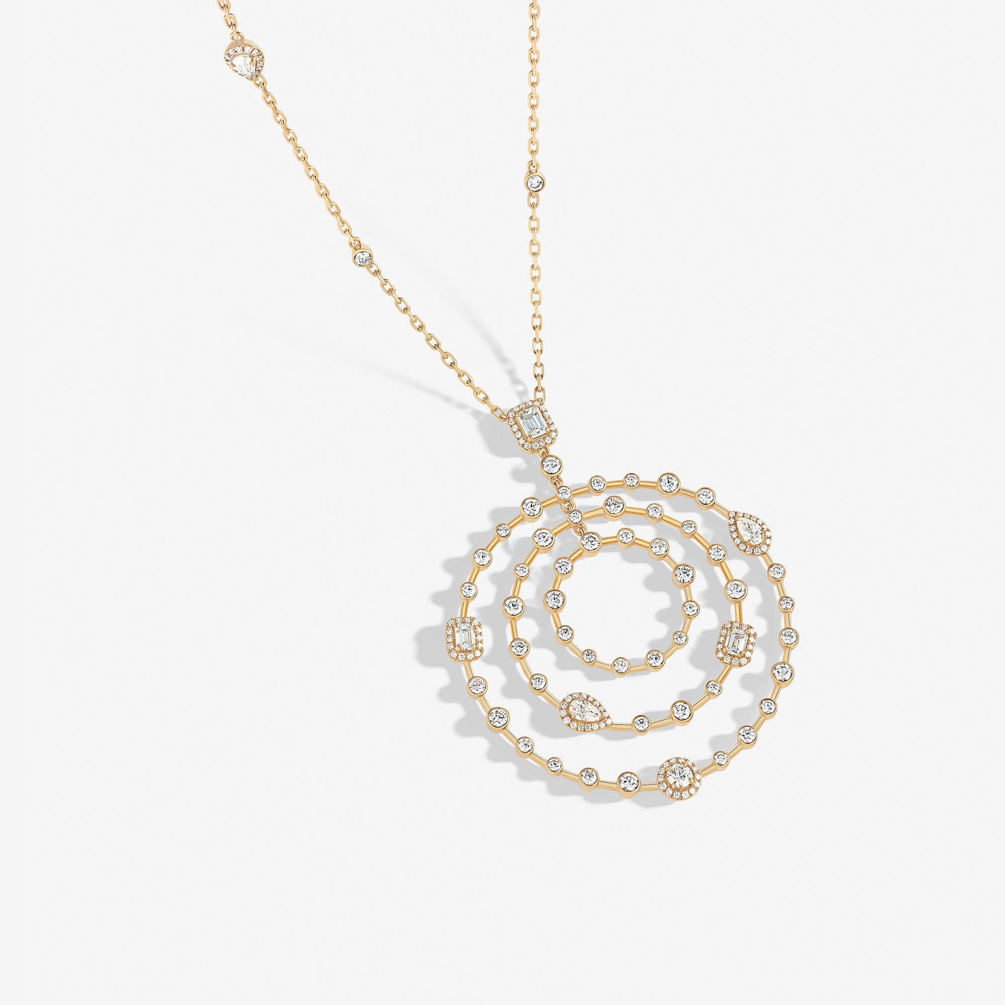 Emblematic of the House values and aesthetic codes, the pieces dazzle with the symbol of the trinity, elevated through three diamond cuts – brilliant, emerald, and pear –, which are brought together within each piece for a unique harmony.