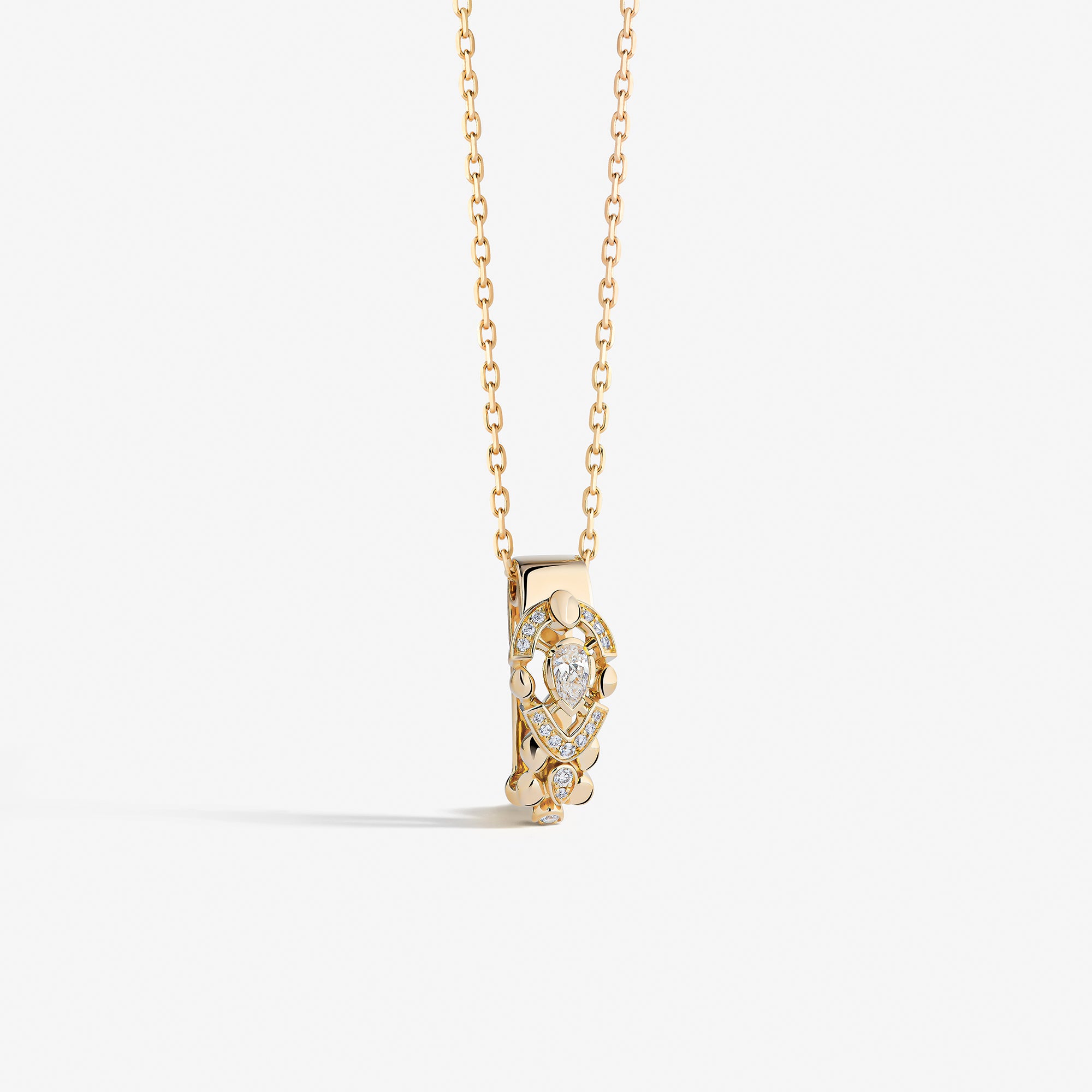 Dualité Signature pendant crafted 18K yellow gold and set with round brilliant diamonds and a pear-shape diamond.