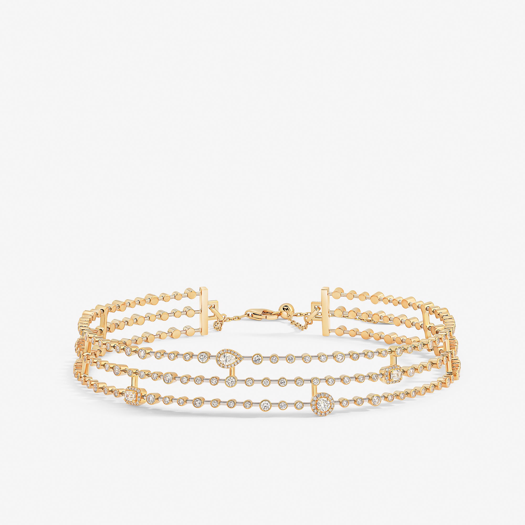 Trilogie Radiance Signature three row flexible choker crafted in 18K yellow gold and set with round brilliant, emerald cut and pear-shaped diamonds.