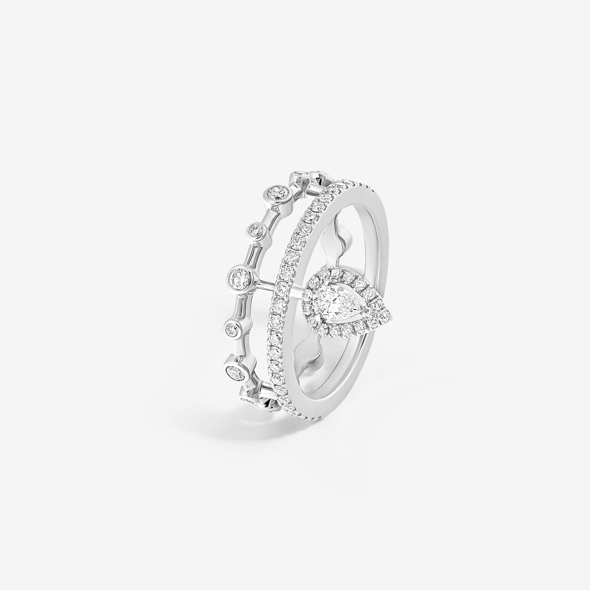 Trilogie Essence Signature pixie ring crafted in 18K white gold and set with round brilliant, emerald cut and pear-shaped diamonds.