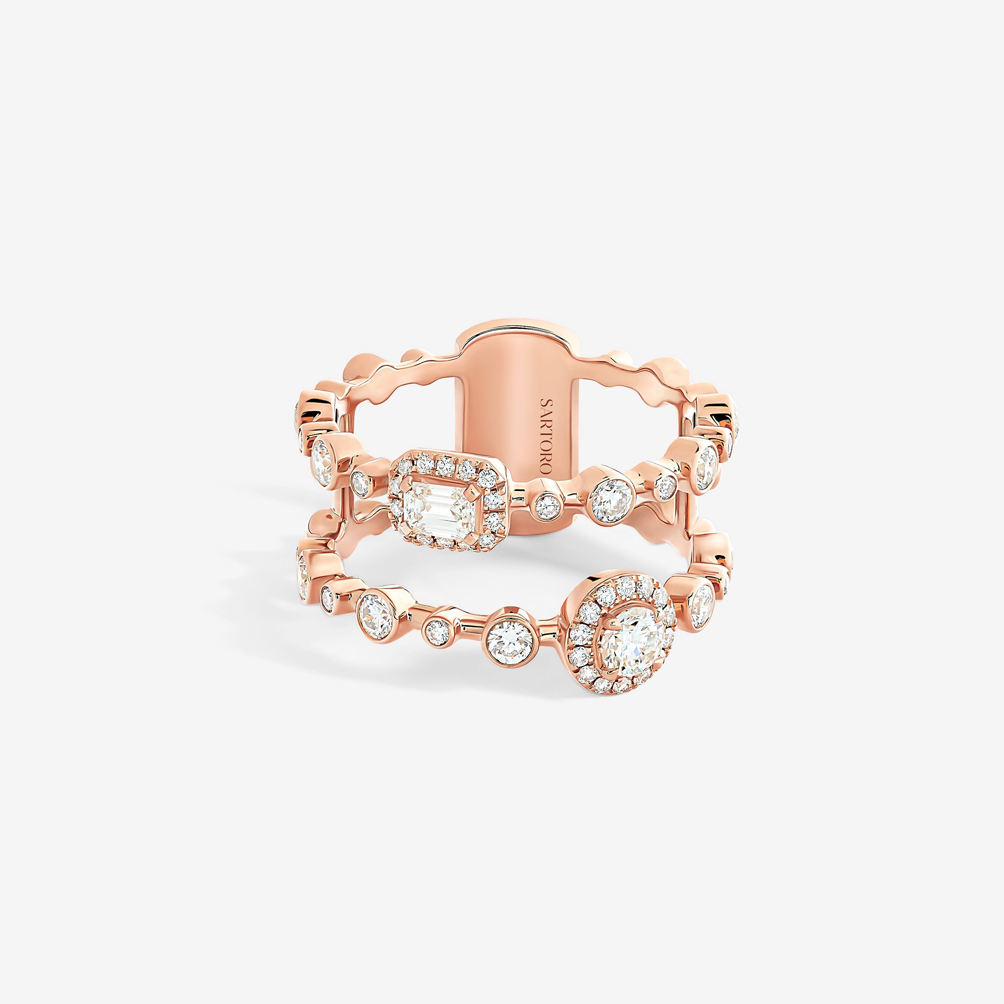 Trilogie Radiance Signature two row ring crafted in 18K rose gold and set with round brilliant, emerald cut and pear-shaped diamonds.