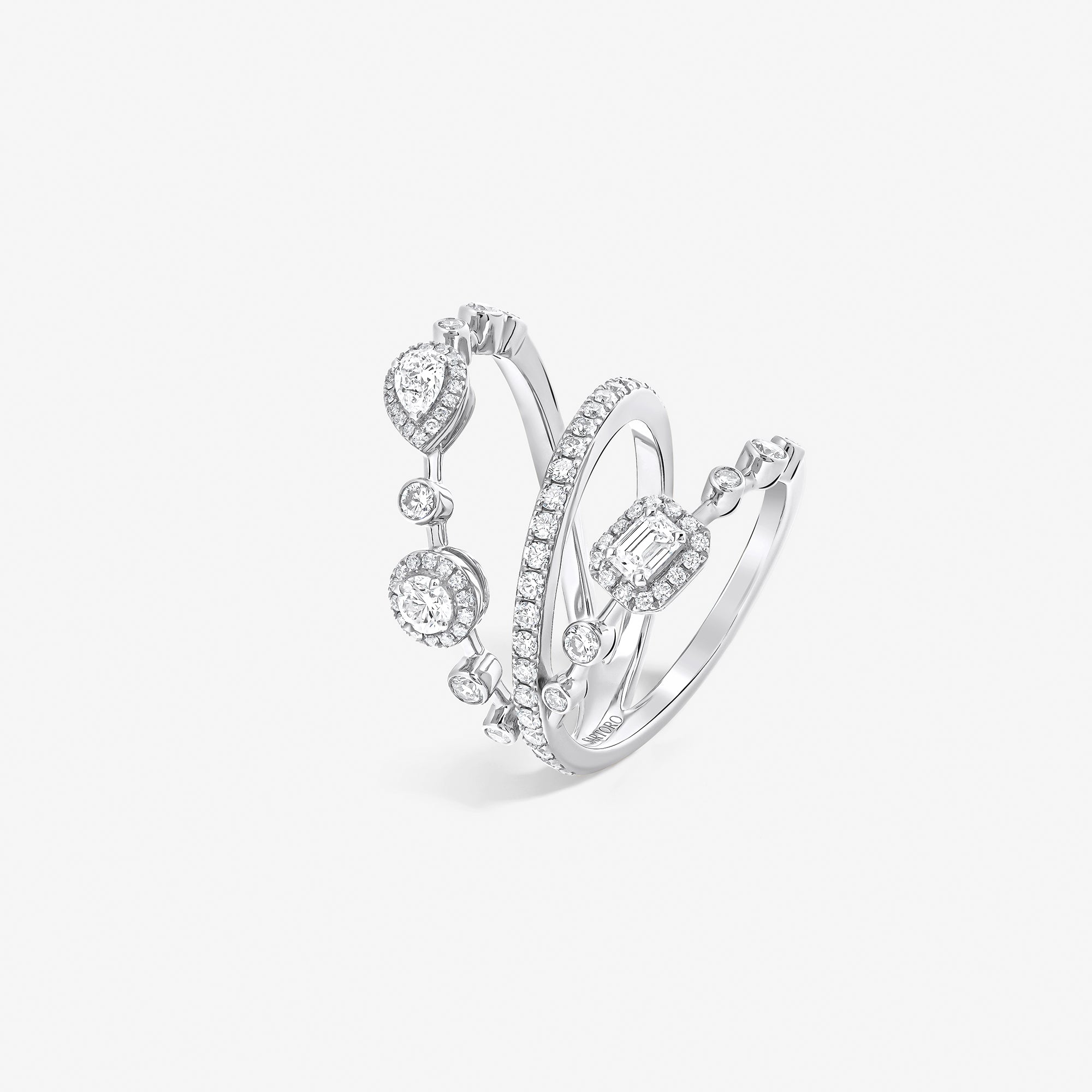 Trilogie Radiance Trio ring crafted in 18K white gold and set with round brilliant, emerald cut and pear-shaped diamonds.