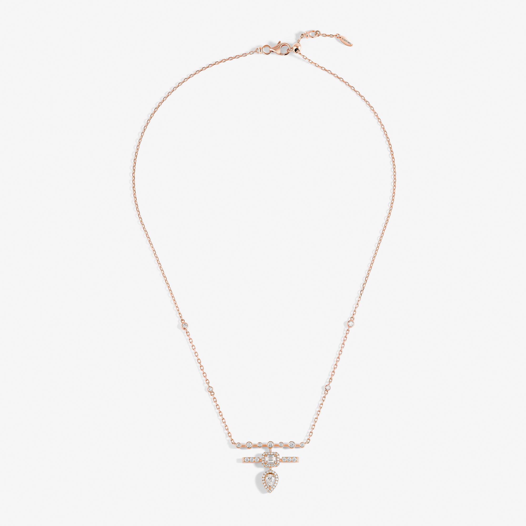 Trilogie Essence pendant crafted in 18K rose gold and set with round brilliant, emerald cut and pear-shaped diamonds.