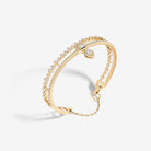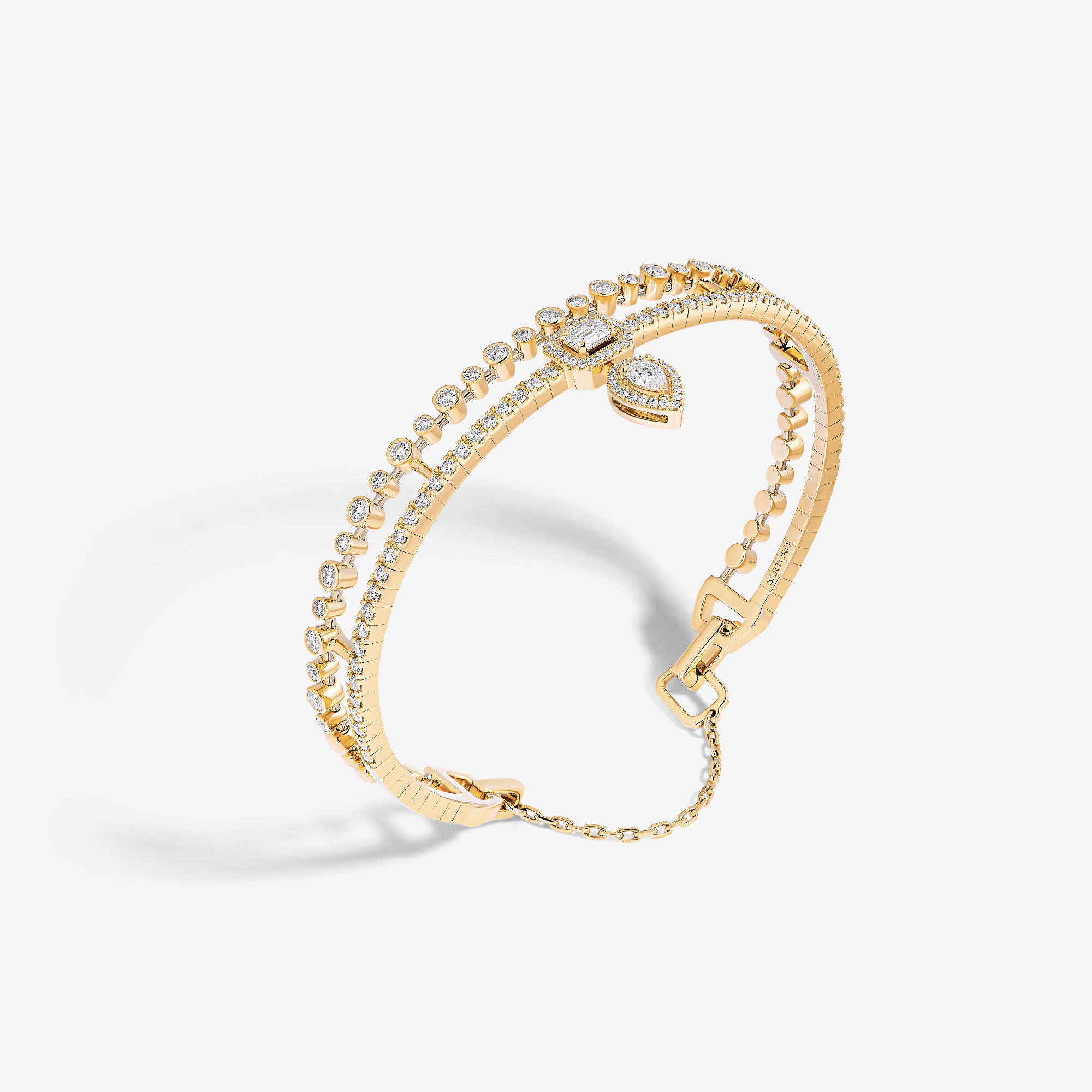 Trilogie Essence Signature drop bangle crafted in 18K yellow gold and set with round brilliant, emerald cut and pear-shaped diamonds.