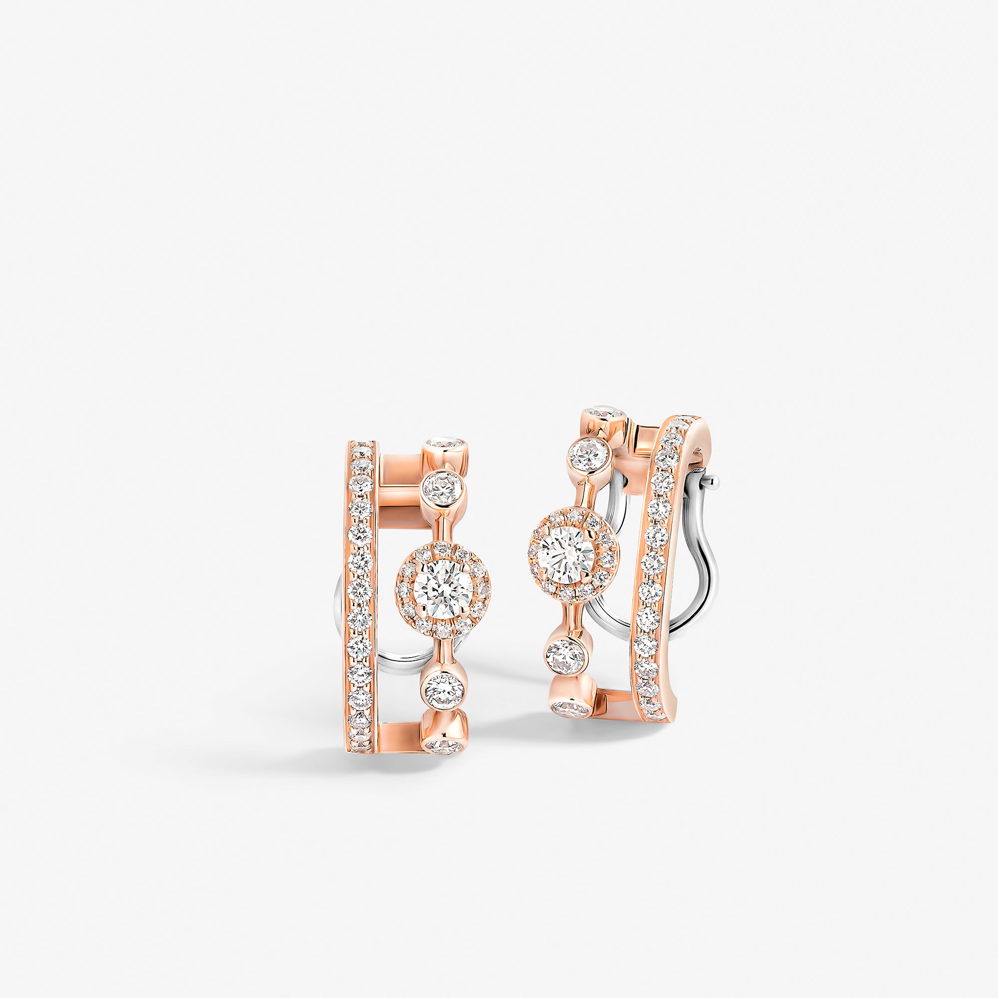Trilogie Forever clip earrings crafted in 18K rose gold and set with round brilliant, emerald cut and pear-shaped diamonds.