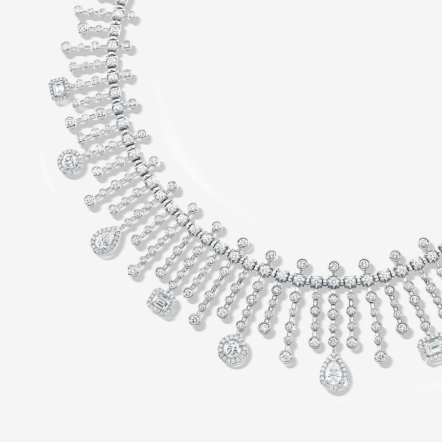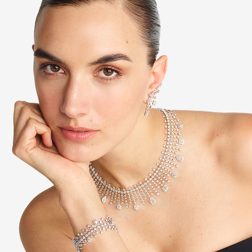 Emblematic of the House values and aesthetic codes, the pieces dazzle with the symbol of the trinity, elevated through three diamond cuts – brilliant, emerald, and pear –, which are brought together within each piece for a unique harmony.