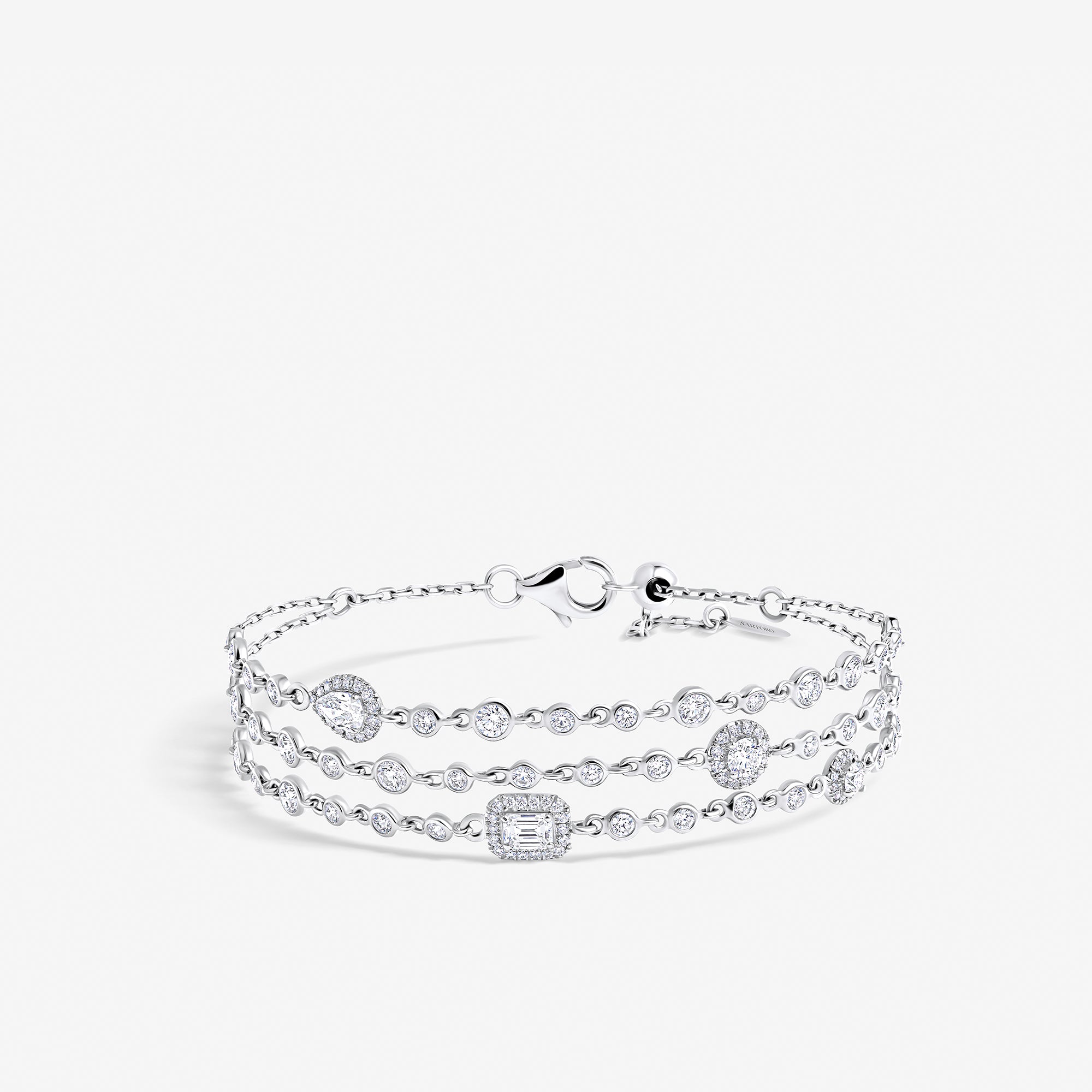 Trilogie Radiance Signature chain bracelet crafted in 18K white gold and set with round brilliant, emerald cut and pear-shaped diamonds.