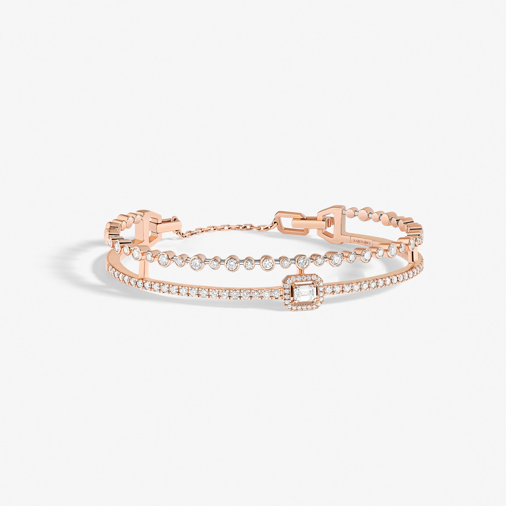 Trilogie Essence Signature bangle crafted in 18K rose gold and set with round brilliant, emerald cut and pear-shaped diamonds.