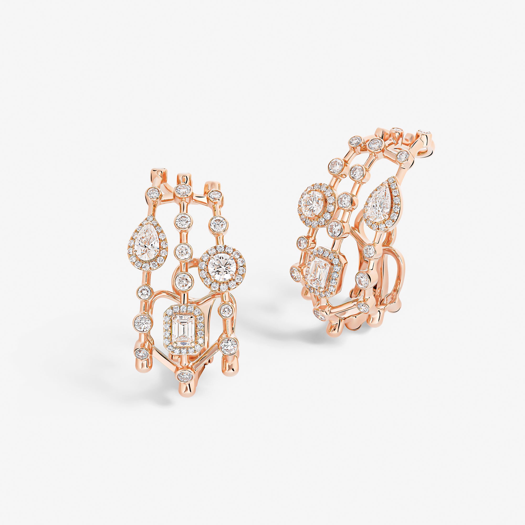 Emblematic of the House values and aesthetic codes, the pieces dazzle with the symbol of the trinity, elevated through three diamond cuts – brilliant, emerald, and pear –, which are brought together within each piece for a unique harmony.