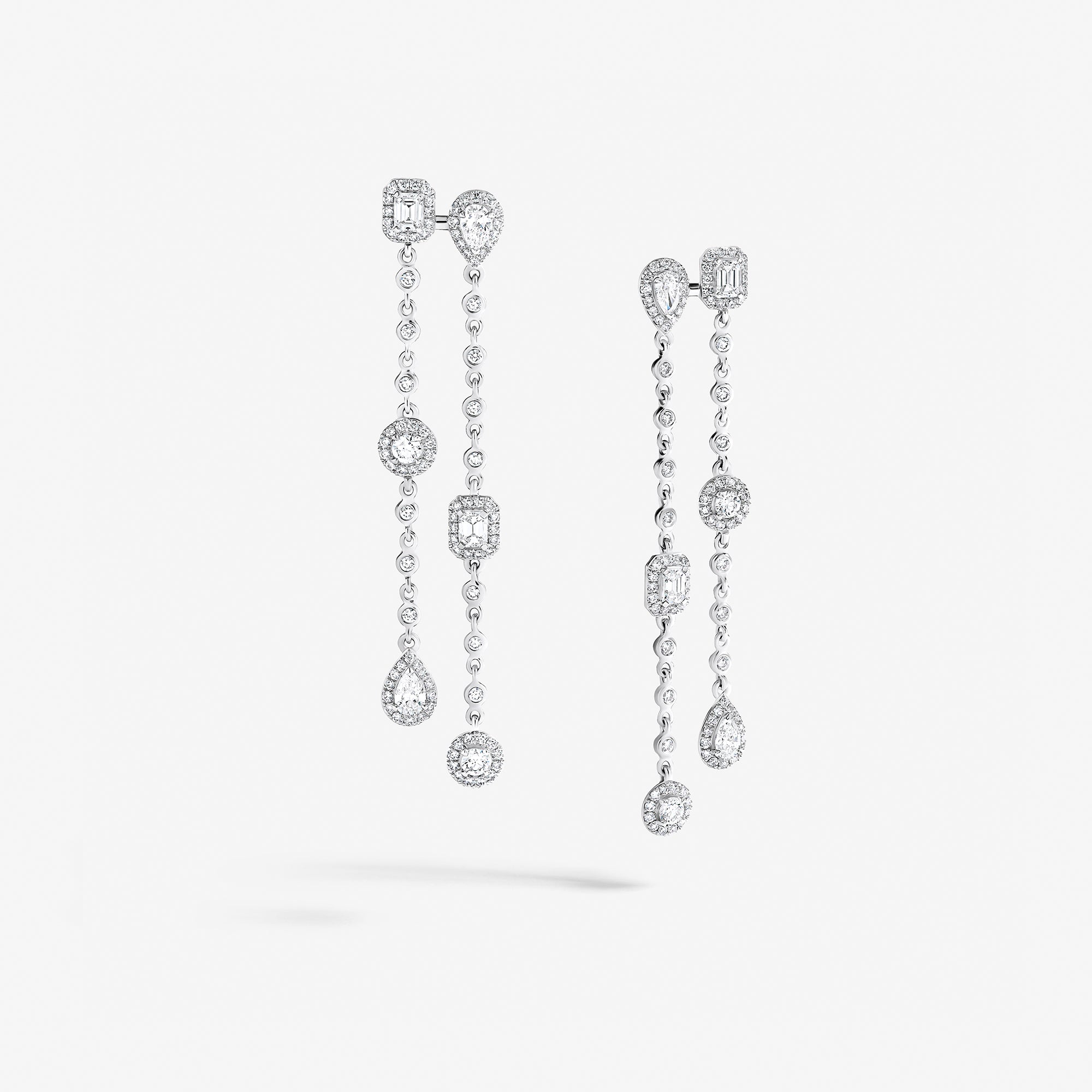 Trilogie Radiance Signature chain earrings crafted in 18K white gold and set with round brilliant, emerald cut and pear-shaped diamonds.