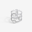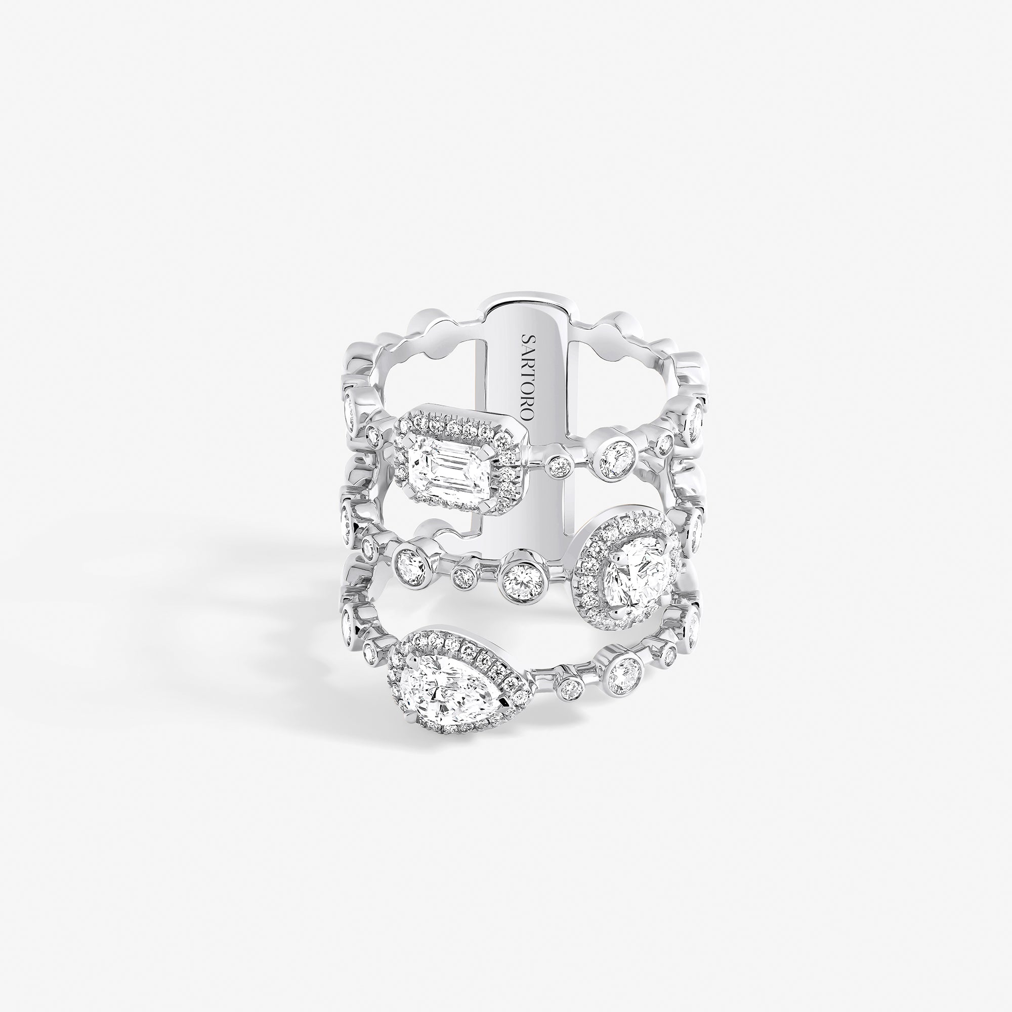 Trilogie Radiance Signature three row ring crafted in 18K white gold and set with round brilliant diamonds and 0.40 carat central round brilliant, emerald cut and pear-shaped diamonds.