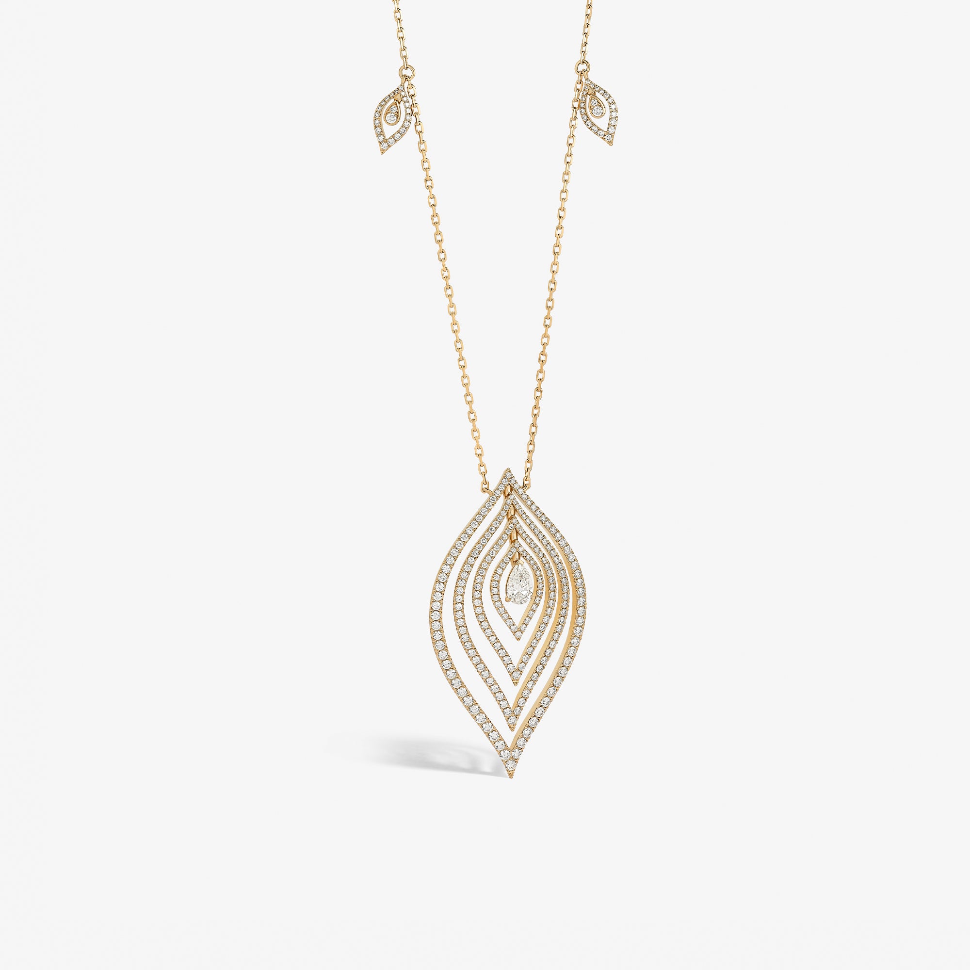 Ondes Signature ring crafted in 18K yellow gold and set with round brilliant diamonds and a central pear-shaped diamond.