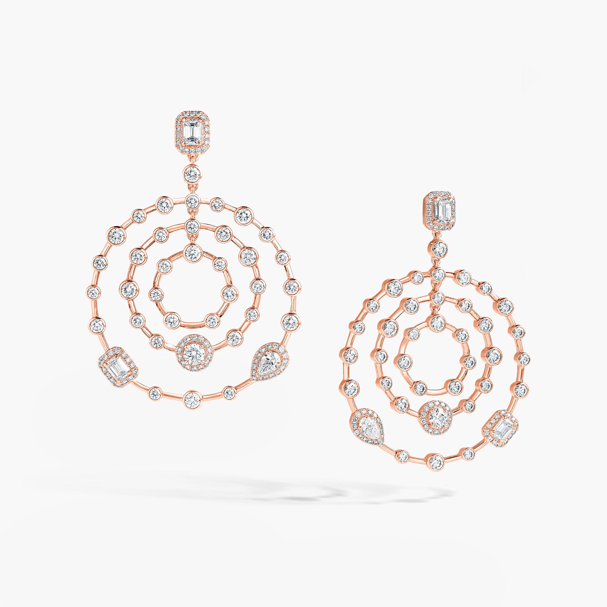 Trilogie Radiance Signature small round earrings crafted in 18K rose gold and set with round brilliant, emerald cut and pear-shaped diamonds.