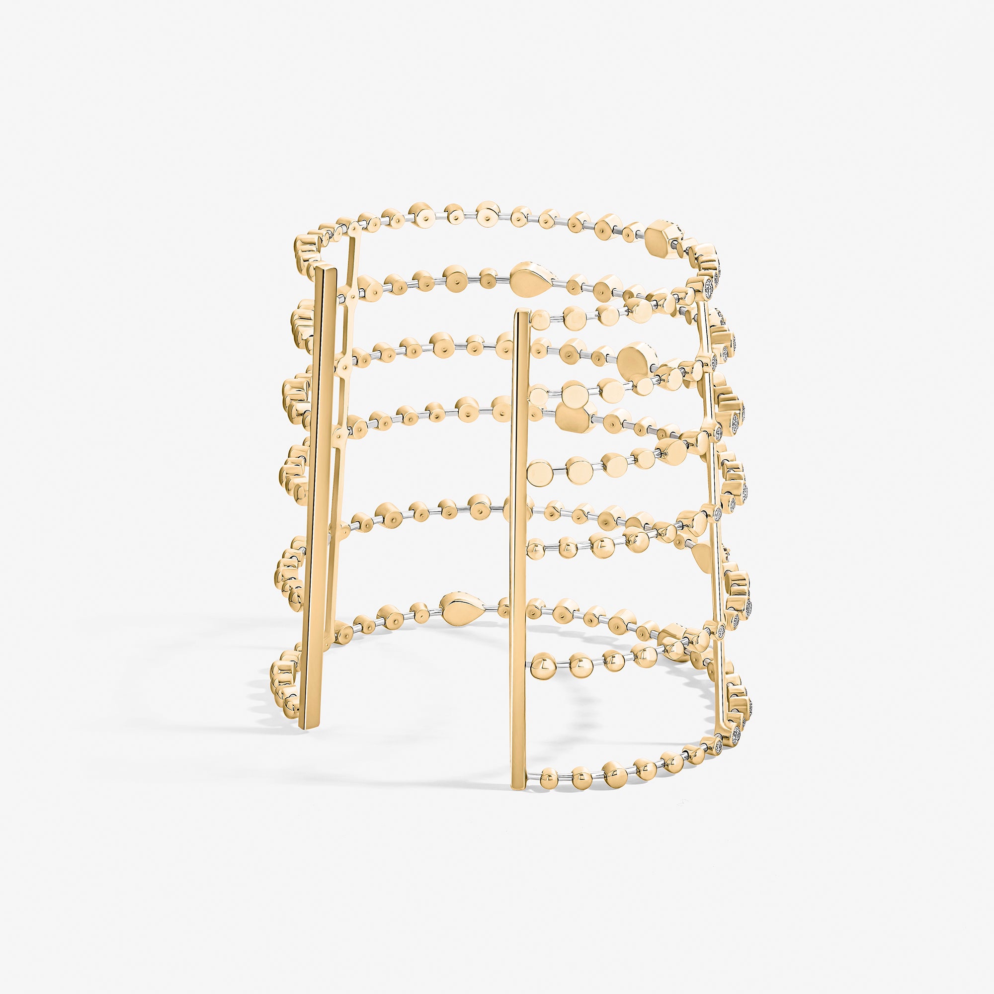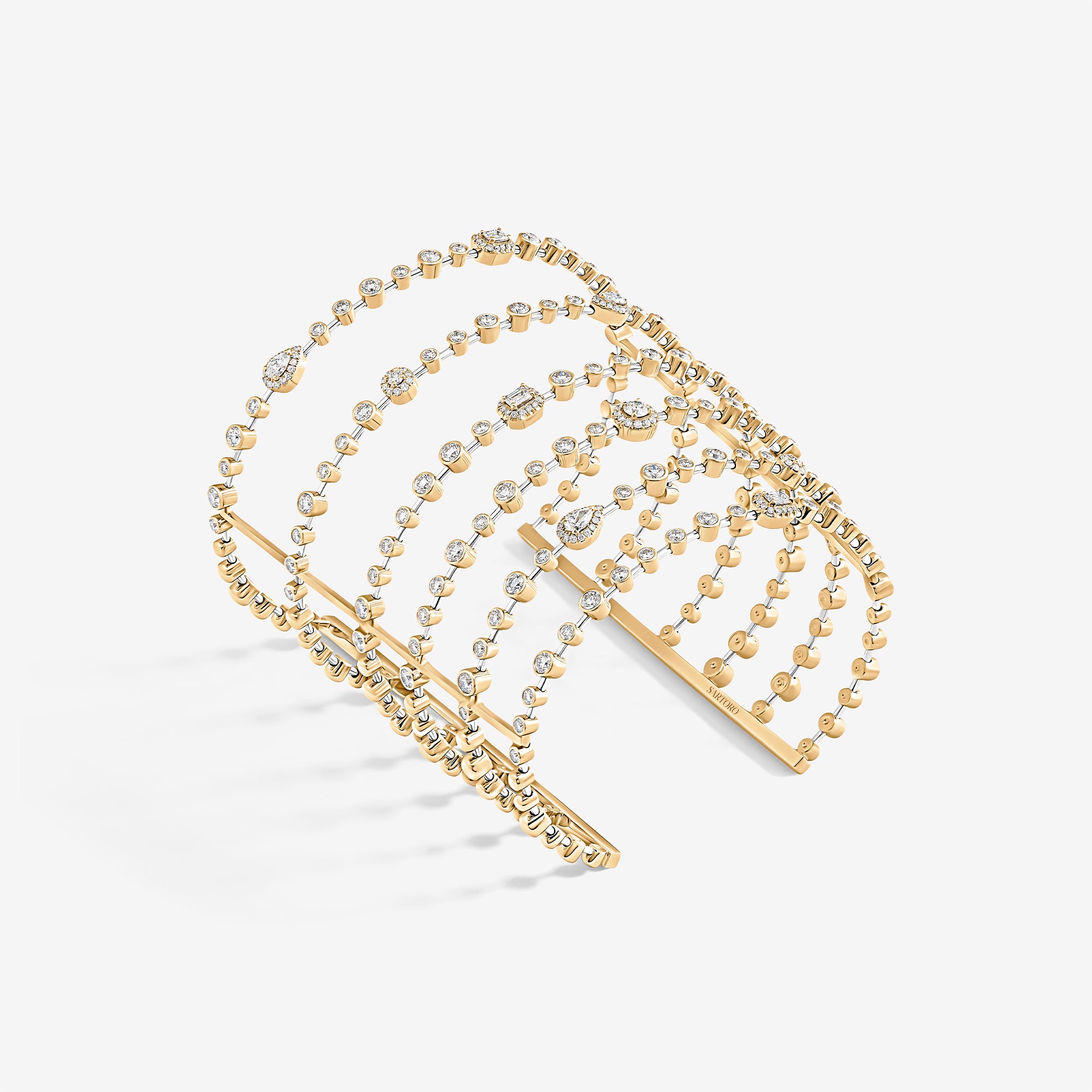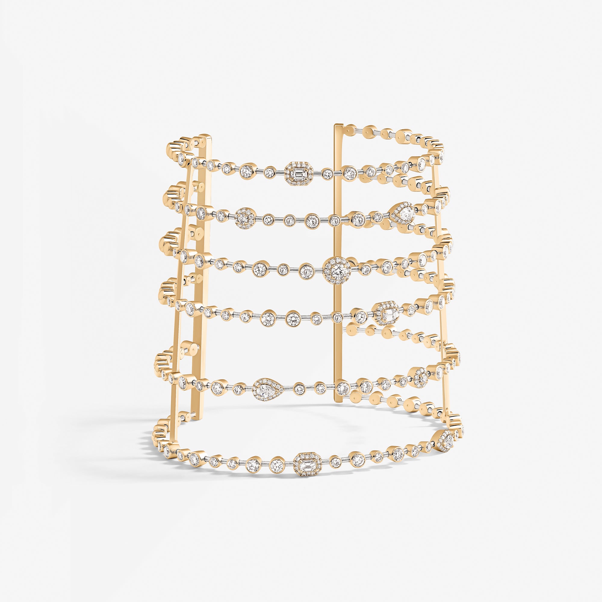 Trilogie Radiance cuff crafted in 18K yellow gold and set with round brilliant, emerald cut and pear-shaped diamonds.