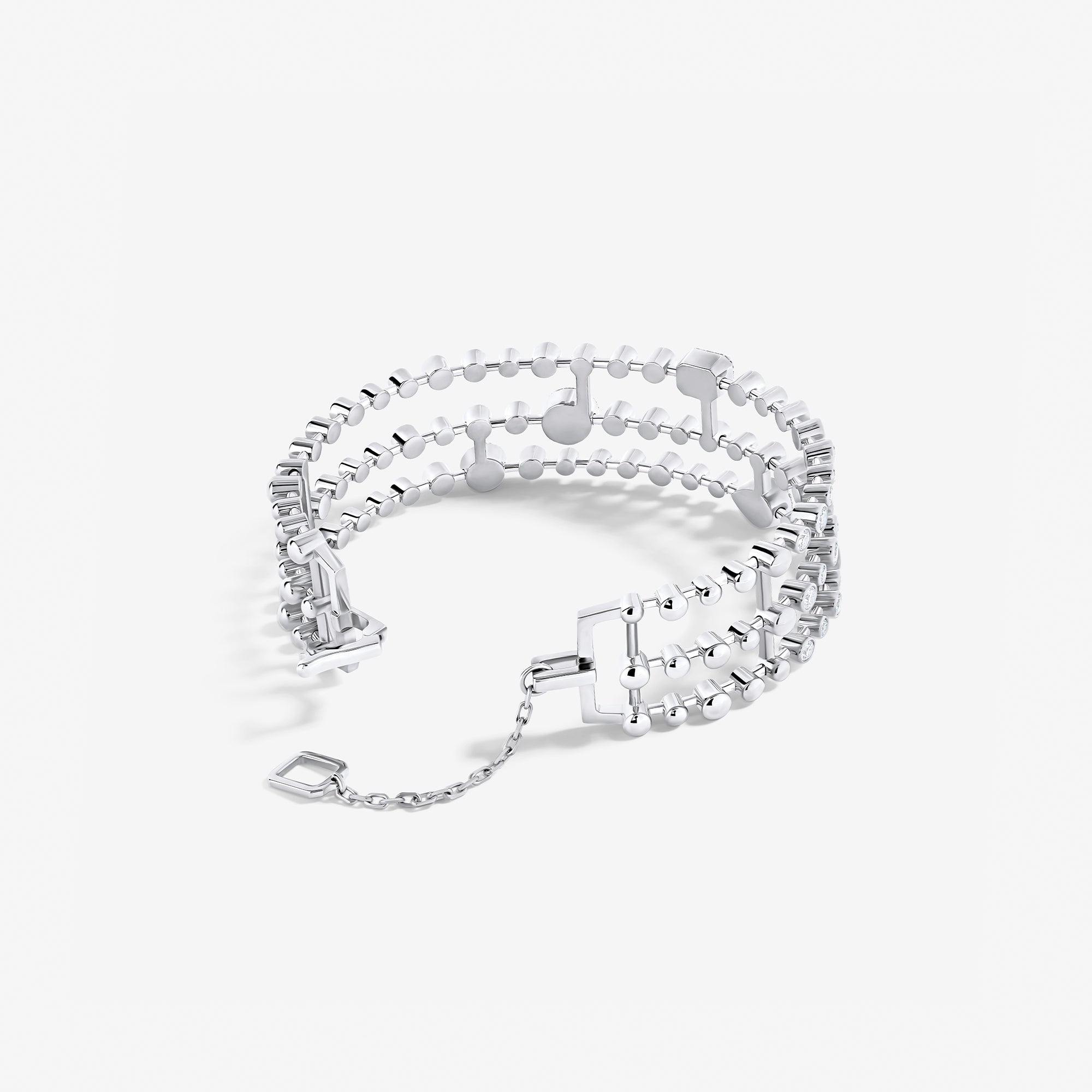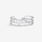 Trilogie Radiance Signature three row bangle crafted in 18K white gold and set with round brilliant, emerald cut and pear-shaped diamonds.