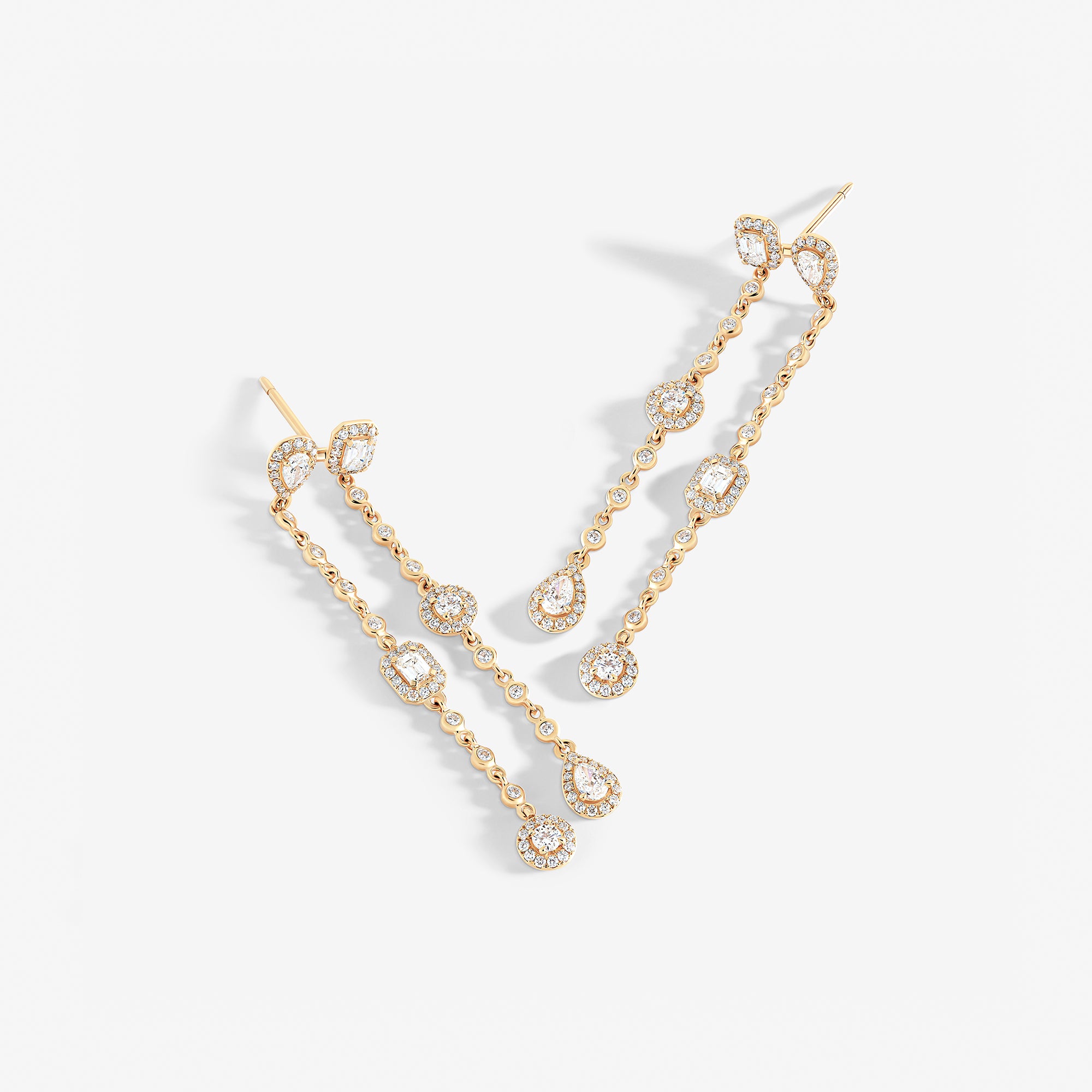 Emblematic of the House values and aesthetic codes, the pieces dazzle with the symbol of the trinity, elevated through three diamond cuts – brilliant, emerald, and pear –, which are brought together within each piece for a unique harmony.