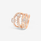 Trilogie Allure Iconic ring crafted in 18K rose gold and set with round brilliant, emerald cut and pear-shaped diamonds.