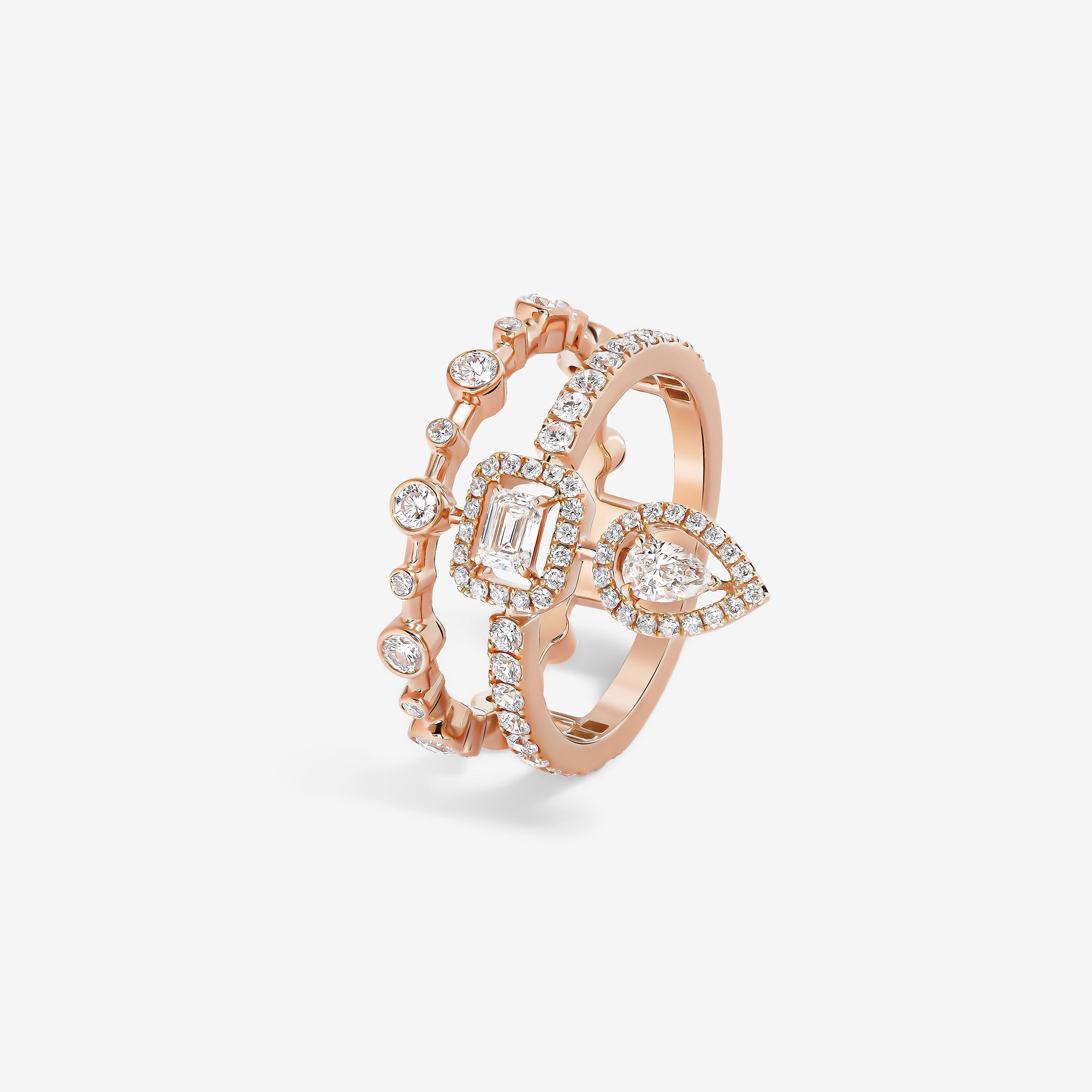 Trilogie Essence Signature ring crafted in 18K rose gold and set with round brilliant, emerald cut and pear-shaped diamonds.