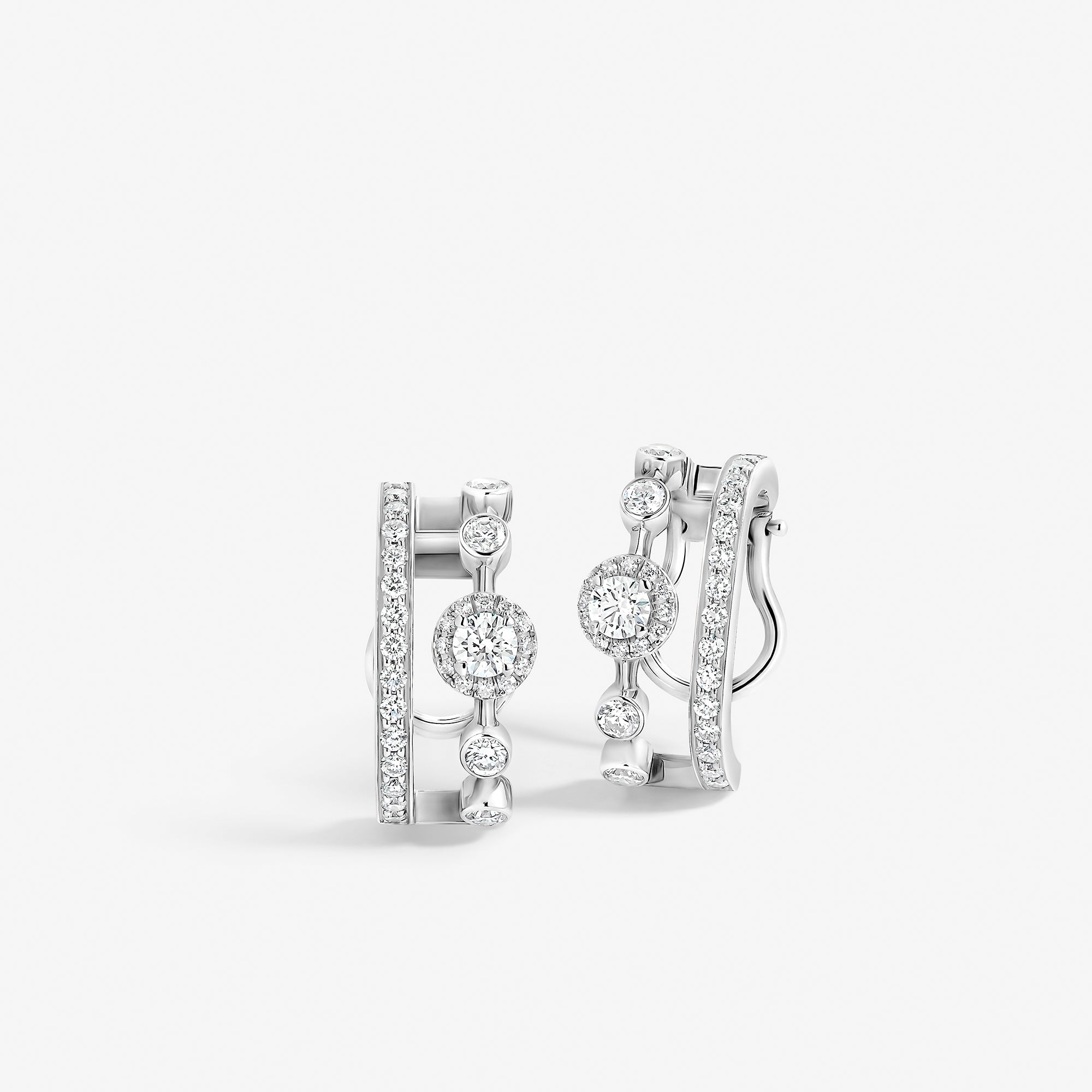 Trilogie Radiance Forever single clip earring with pear-shaped diamond crafted in 18K white gold and set with round brilliant, emerald cut and pear-shaped diamonds.