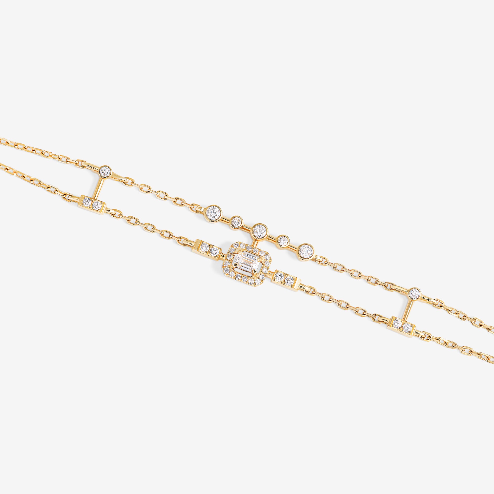Emblematic of the House values and aesthetic codes, the pieces dazzle with the symbol of the trinity, elevated through three diamond cuts – brilliant, emerald, and pear –, which are brought together within each piece for a unique harmony.