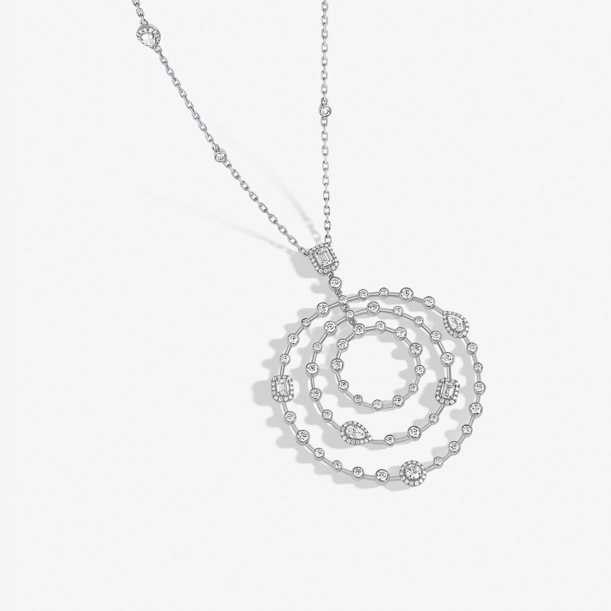 Trilogie Radiance Iconic pendant crafted in 18K white gold and set with round brilliant, emerald cut and pear-shaped diamonds.