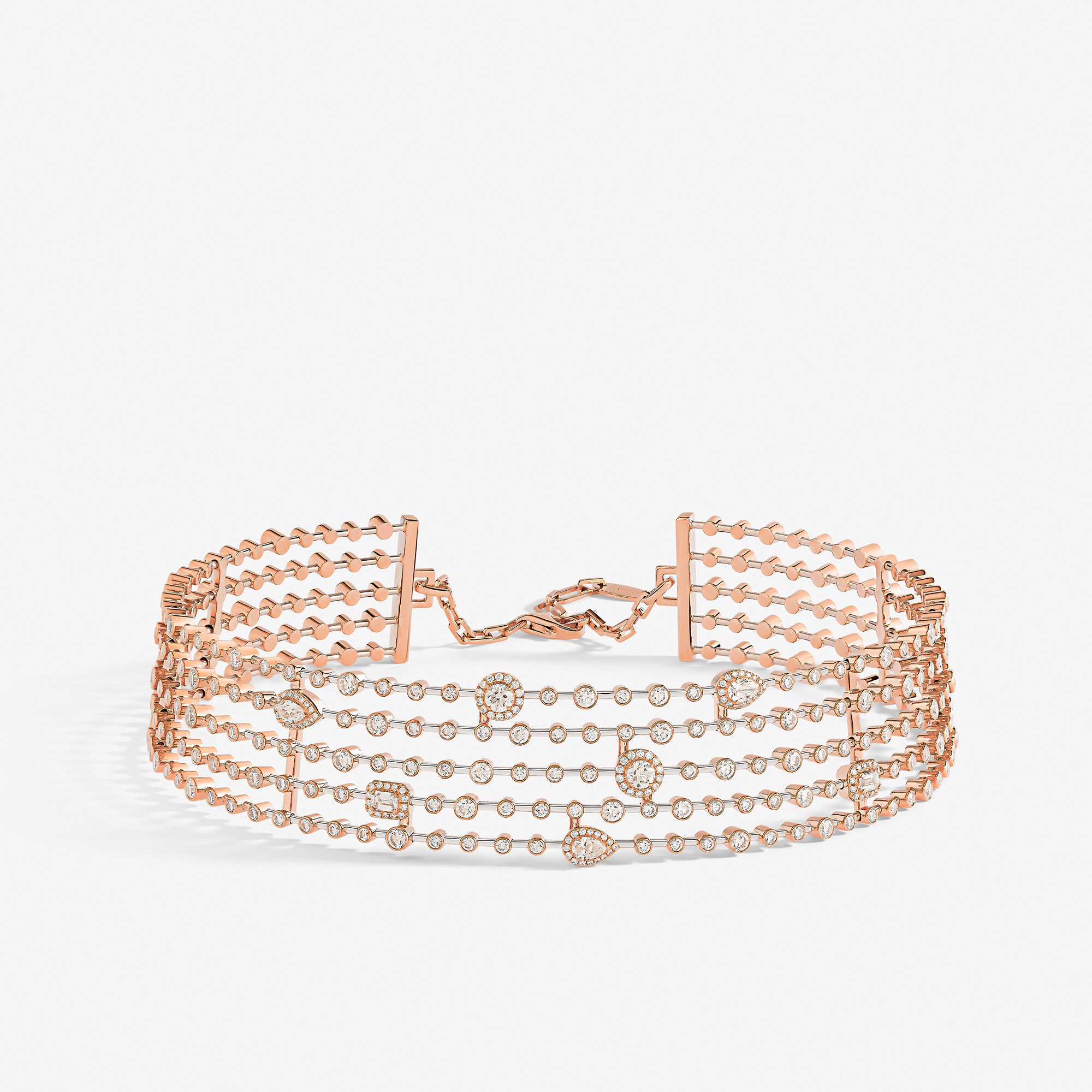 Trilogie Radiance Signature five row flexible choker crafted in 18K rose gold and set with round brilliant, emerald cut and pear-shaped diamonds.